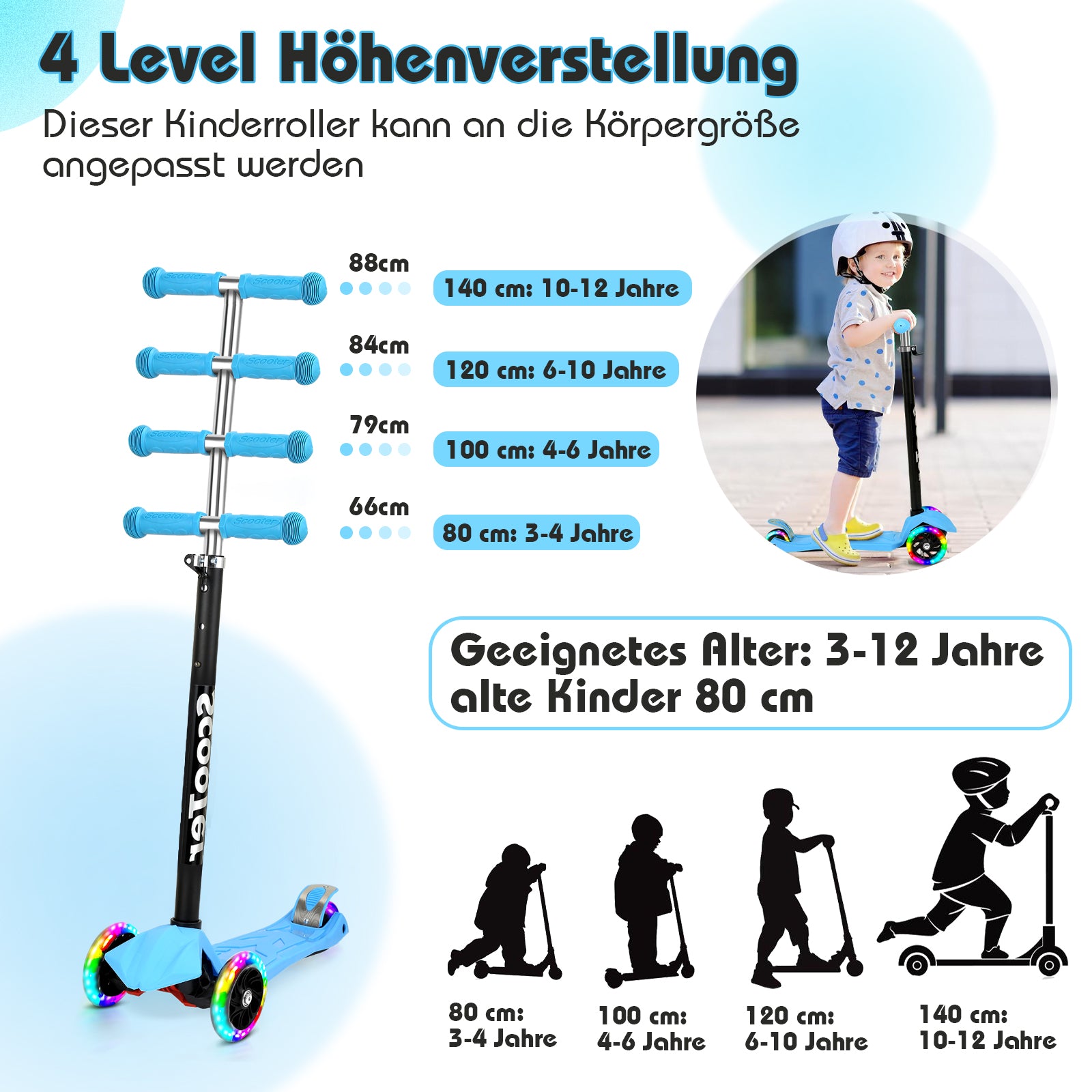 【Höhenverstellbarer 】Der Kinder scooter verfügt über 4 Höhenverstellstufen, und die Höhe des Lenkers kann auf der Innenseite von 66/79/84/88 cm eingestellt werden.was sich gut an die Körpergröße des Kindes anpassen lässt. (Körpergröße von 80 cm bis 140 cm).