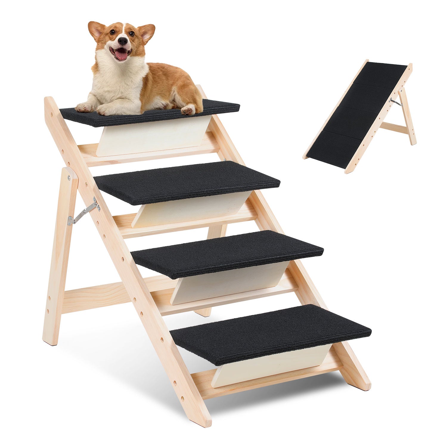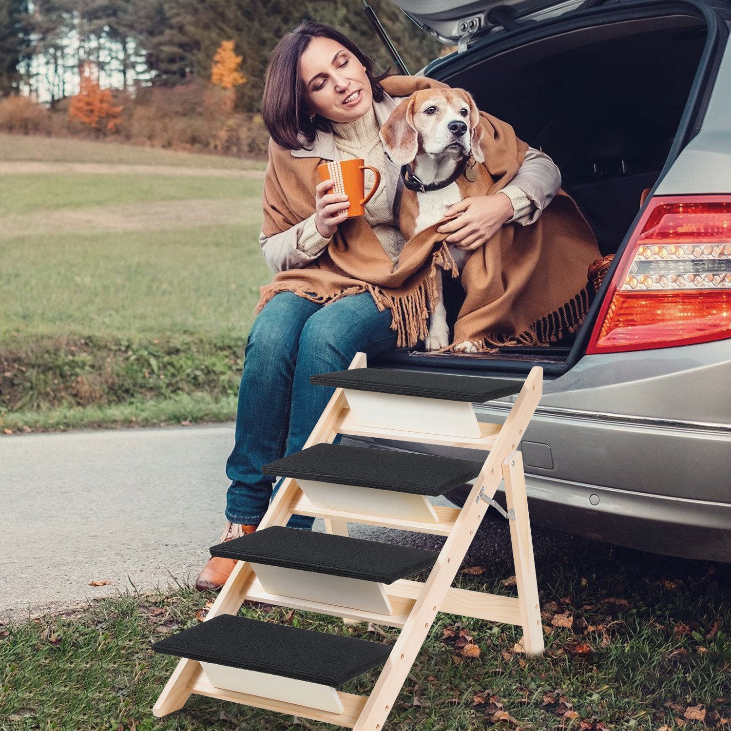 [Treppen für Haustiere] Die Hundetreppe hat eine ausgeklappte Gesamtgröße von 84 x 65,5 x 45 cm und ist für die meisten Haustiere geeignet. Die Haustiertreppe verfügt über vier Stufen, die jeweils 23 cm breit und 14 cm hoch sind. Jede Stufe ist mit einem rutschfesten Teppich versehen, der für die Sicherheit Ihres Haustieres sorgt.