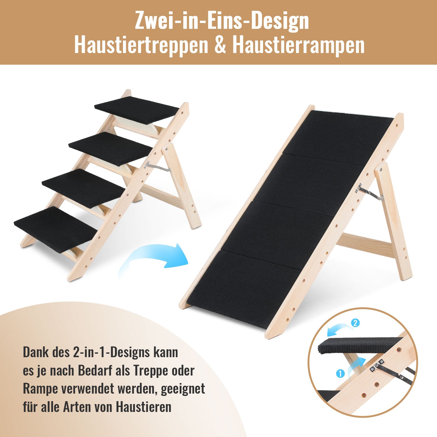 [2-in-1 Design] Dank des 2-in-1 Designs kann die Haustiertreppe je nach Bedarf entweder als Treppe oder als Rampe verwendet werden. Sie ist vielseitig einsetzbar und eignet sich für eine Vielzahl von kleinen und mittelgroßen Haustieren.