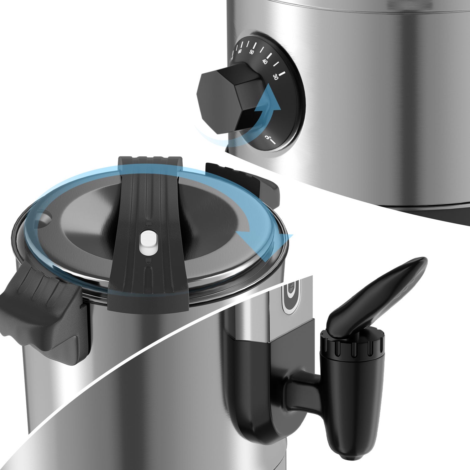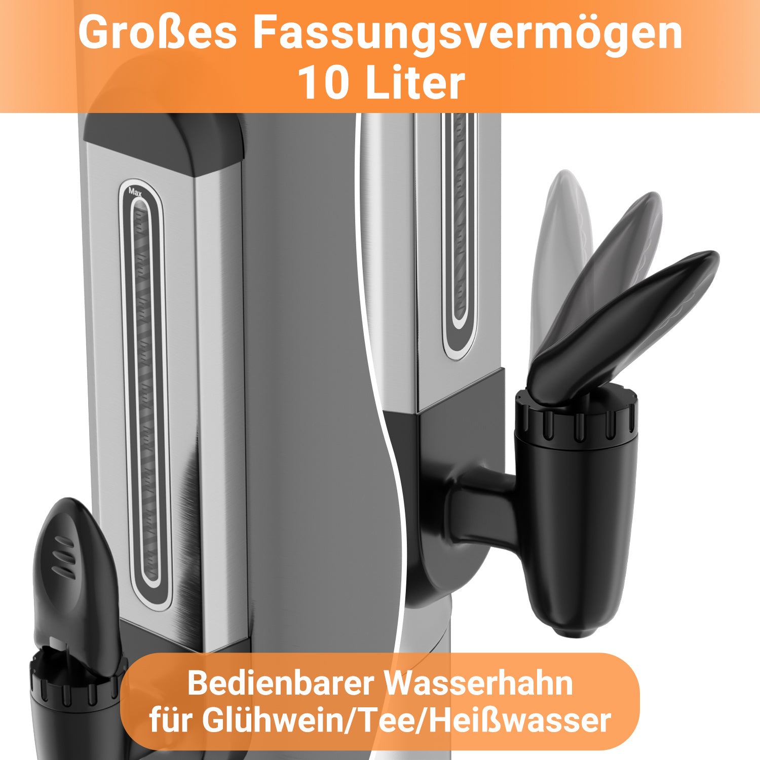 Zusätzliche Funktionen: Integrierte Temperaturregelung (30 bis 110 °C), Thermostat, Überhitzungsschutz, Füllstandsanzeige, Zapfhahn