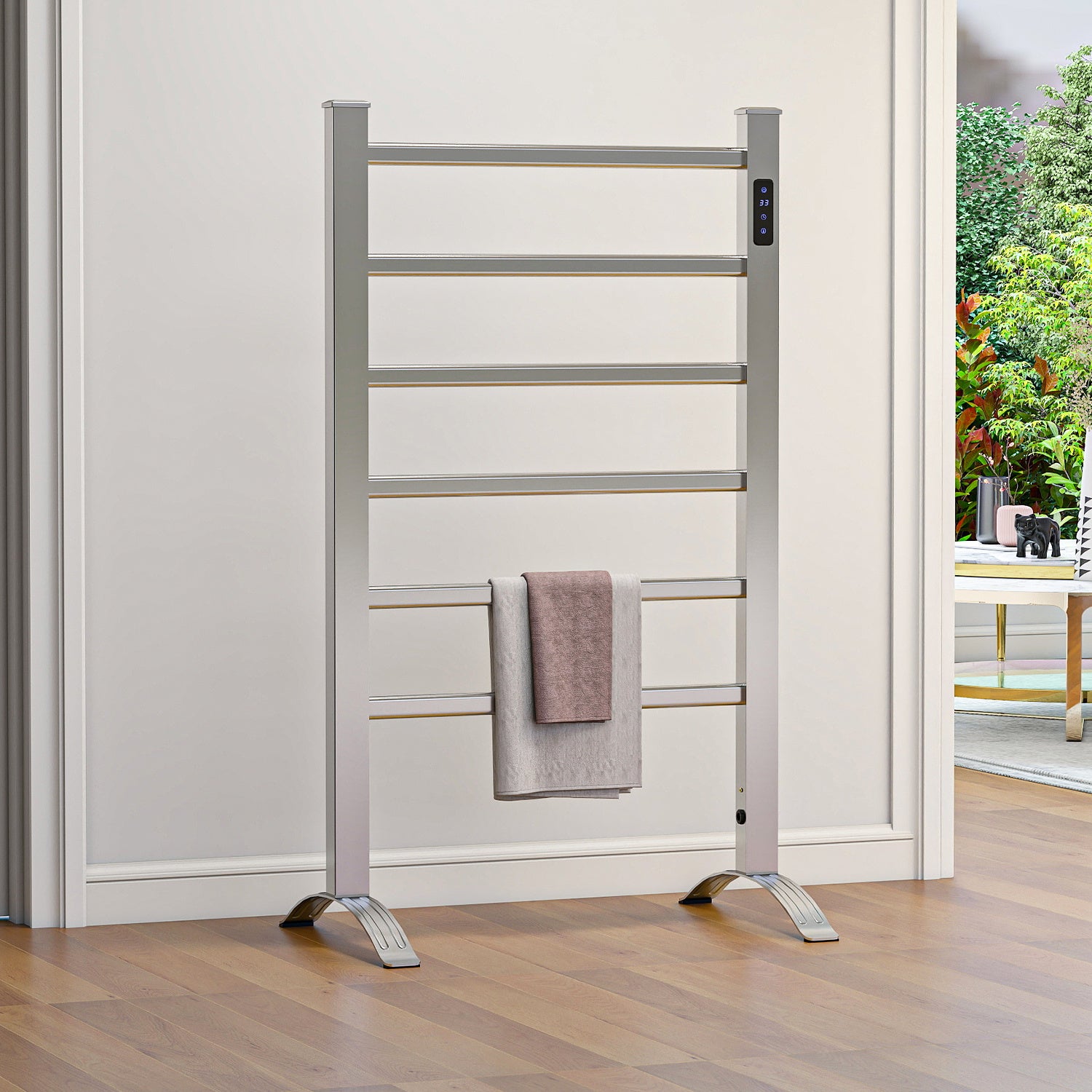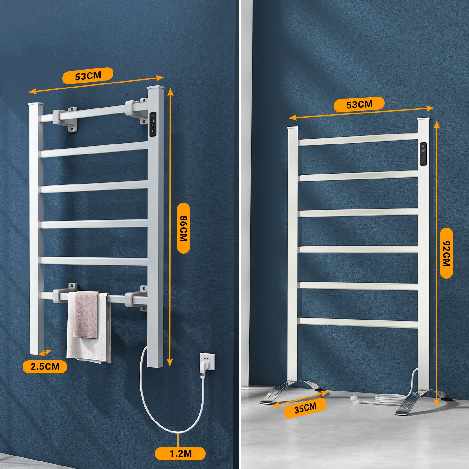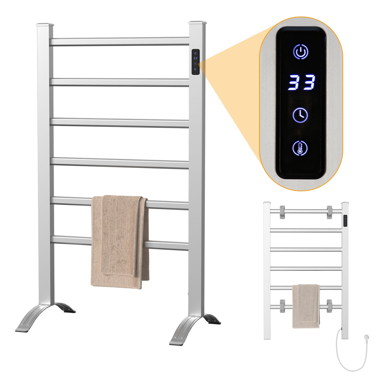Zwei Installationsmöglichkeiten: wandhängend oder Standgerät– bieten zusätzliche Flexibilität. Das moderne Aluminiumdesign kombiniert Stil mit Funktionalität und Handtuchwärmer Elektrisch passt perfekt in jedes Badezimmer.