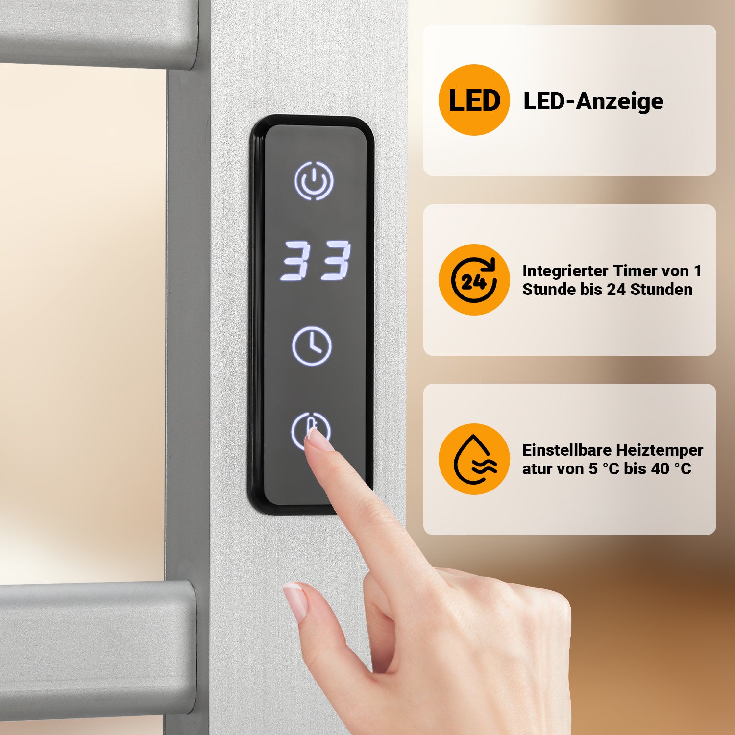 Sicher und Flexibel: Badheizkörper mit Intuitives Touch-Display mit Temperaturregelung von 5–40°C,für individuellen Komfort. Die integrierte Timer, Fenstererkennung und der Überhitzungsschutz garantieren Sicherheit und Flexibilität.