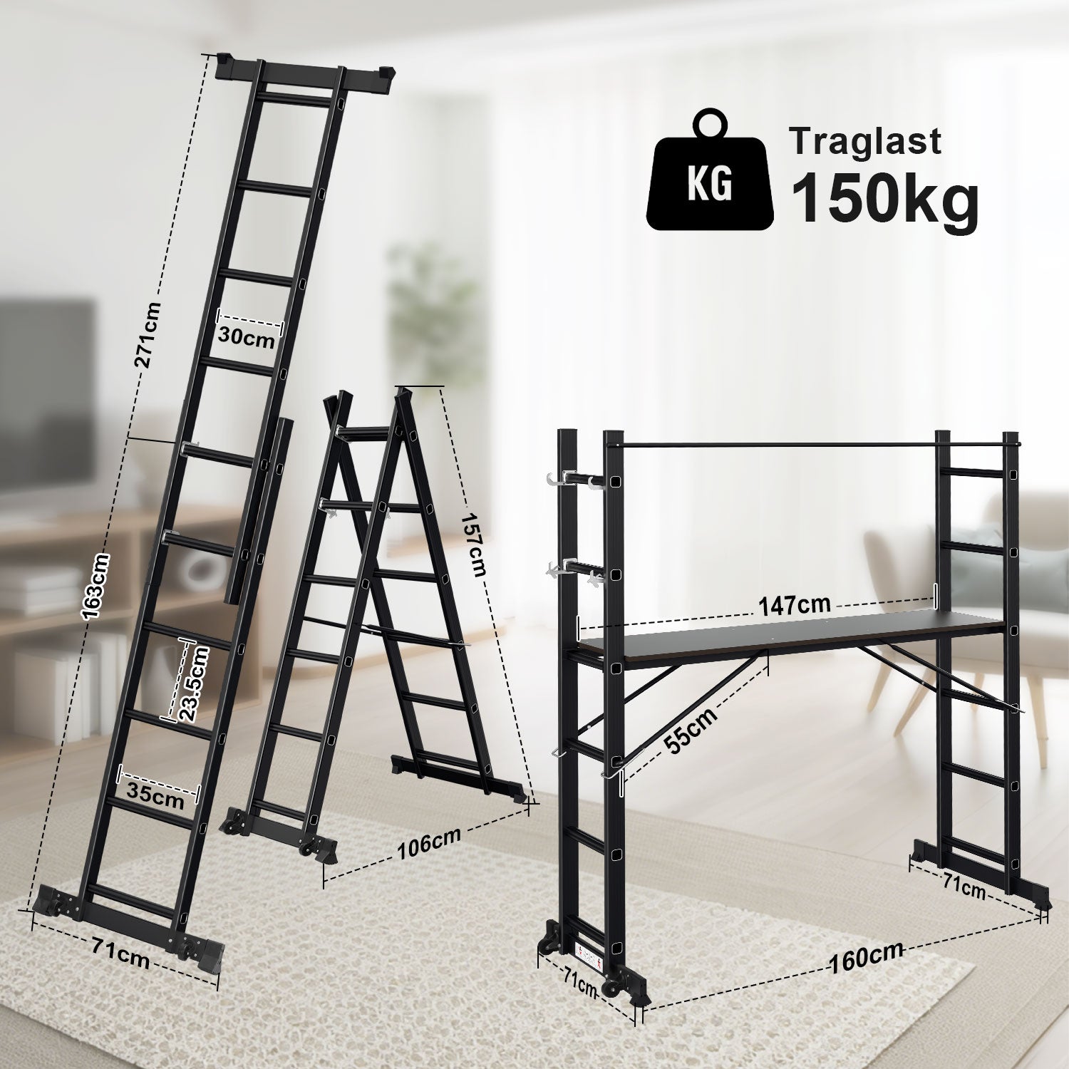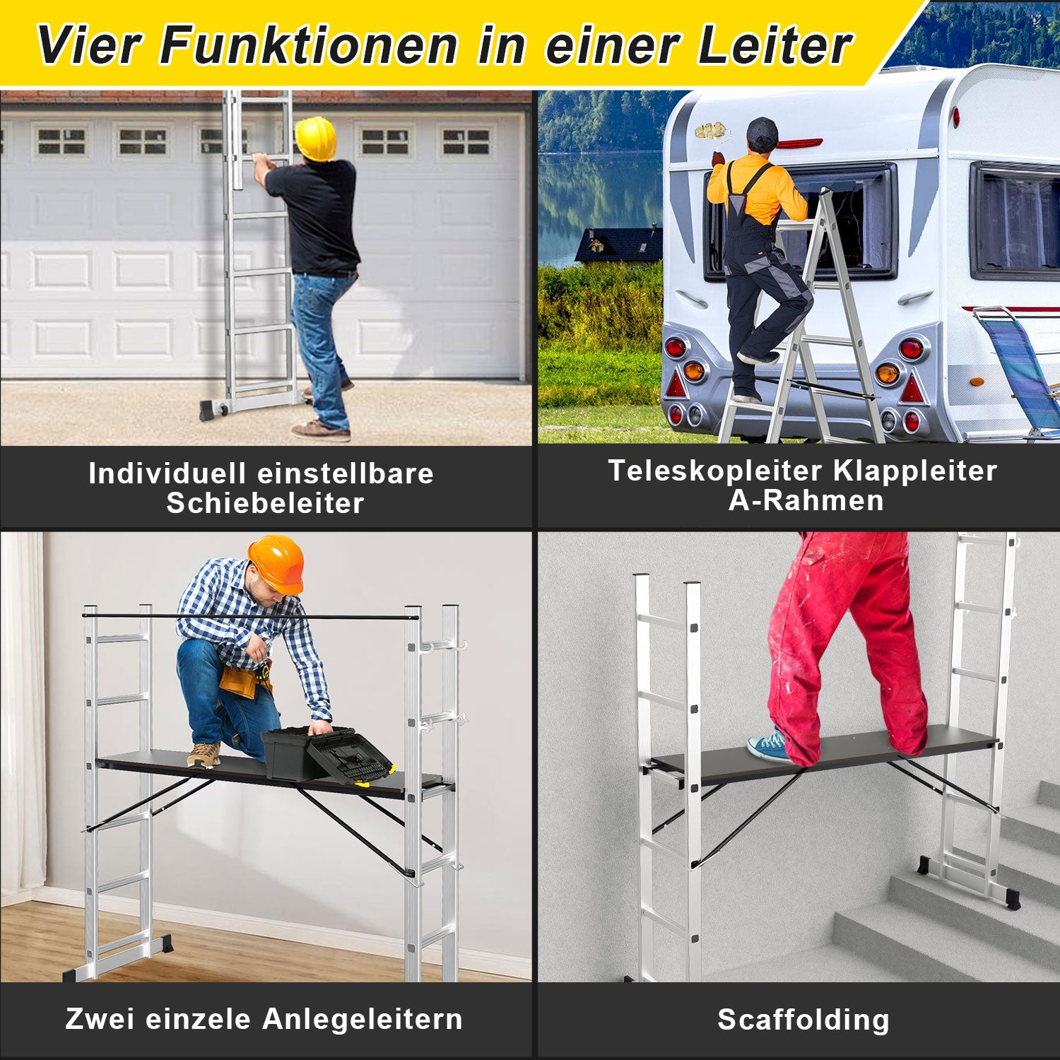 【4 IN 1 Mehrzweckleiter】Mit wenigen Handgriffen lässt sich die Mehrzweckleiter in eine Standleiter, Bockleiter oder ein Leitergerüst umbauen. umwandeln, um Ihren unterschiedlichen Bedürfnissen gerecht zu werden. Mehrere Sicherheitsschlösser können Ihre persönliche Sicherheit gewährleisten.Die geriffelten Stufen bieten einen besseren Halt und sorgen für zusätzliche Sicherheit.