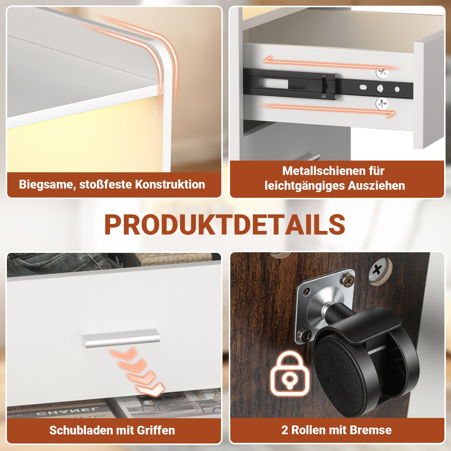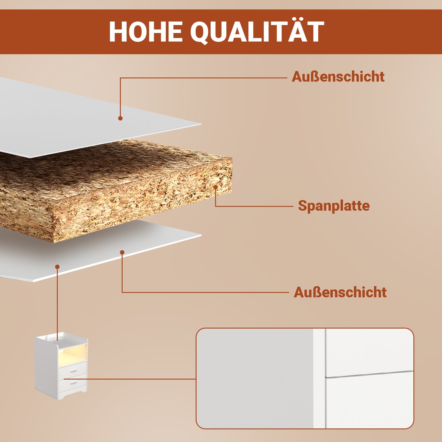【STABIL UND LANGLEBIG】Dieser LED-Nachttisch besteht aus hochwertiger Spanplatte, ist stabil und sehr belastbar. Die Oberfläche ist wasserfest, kratzfest und leicht zu reinigen. Die Schubladen laufen auf hochwertigen Schienen leicht und leise. Zusammen mit dem verstärkten Fußteil garantiert das lange Haltbarkeit.