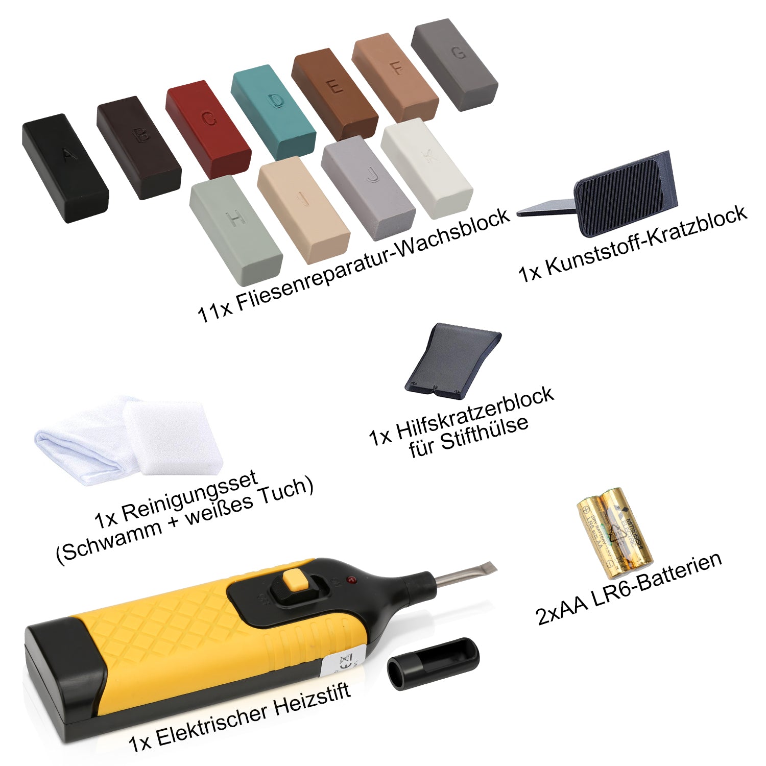 Fliesen reparaturset inklusive Wachsschmelzer, Reinigungsschaber, Spachtel, 11 Hartwachsstangen, Schleifschwamm, Reinigungstuch, Batterien, Aufbewahrungskoffer und Anleitung.