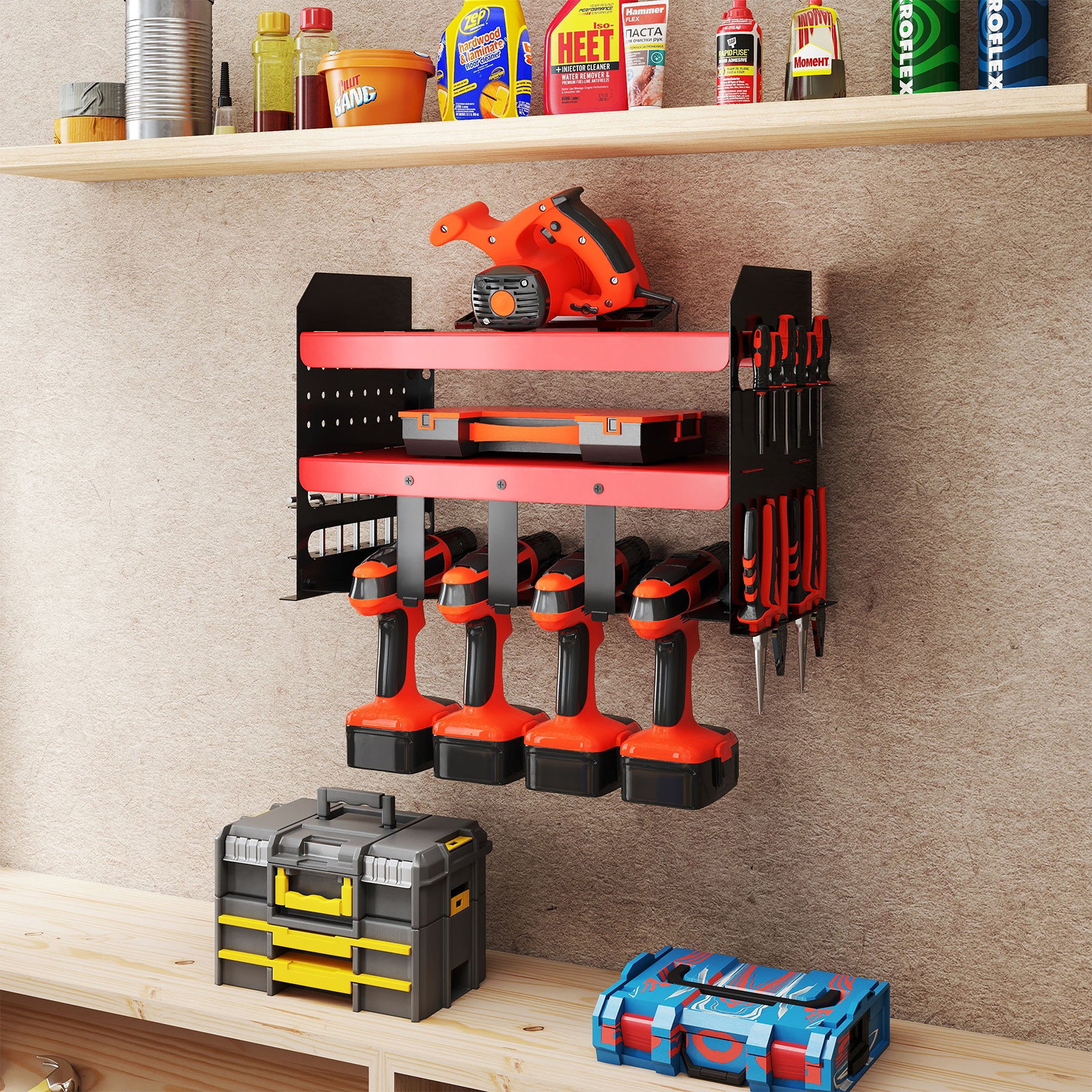 Hochwertige Materialien:Werkzeughalter aus robustem & Stahl, mit elektrostatischer Pulverbeschichtung für hervorragenden Schutz vor Feuchtigkeit und Korrosion. Unser Elektrowerkzeug-Organizer ist nicht nur langlebig, sondern auch stilvoll und kann mühelos bis zu 70 kg tragen.