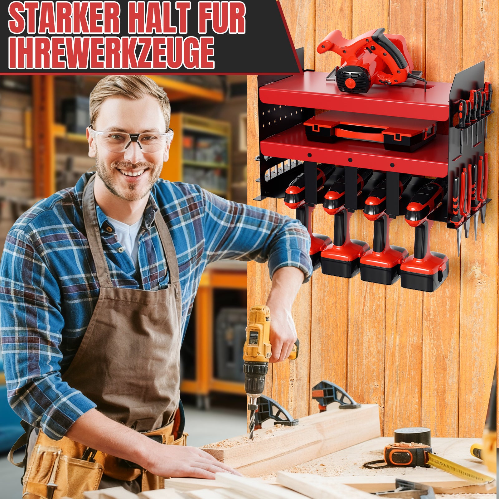 Wandhalterung speziell für Elektrowerkzeuge konzipiert, bietet er ausreichend Platz für Werkzeuge und Zubehör. Mit doppeltem Stauraum und vier Bohrerhaltern sorgt unser Werkzeugregal für Ordnung und Effizienz in Ihrer Werkstatt. Die Wandbefestigung sorgt für einen freien Arbeitsbereich.