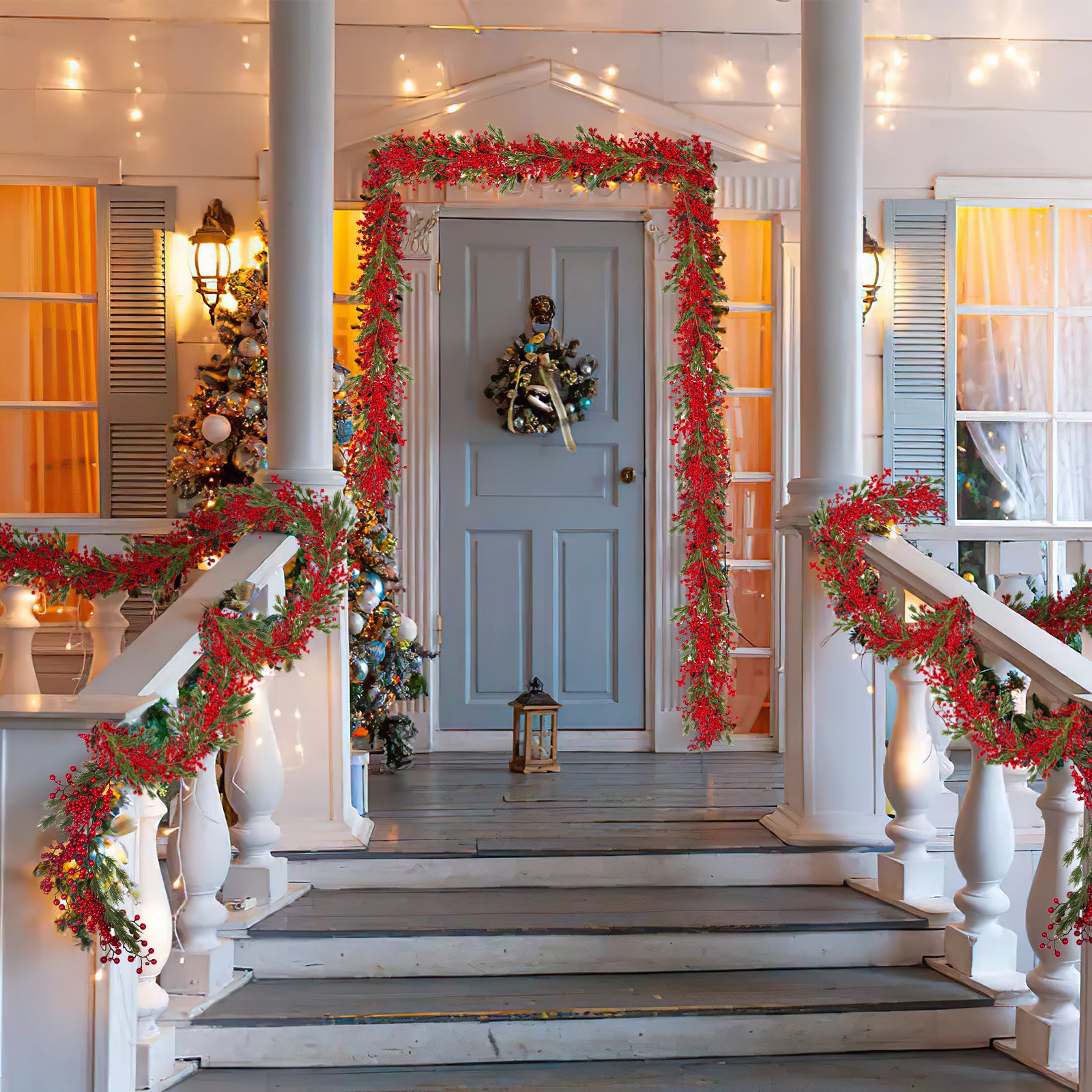 🌸 Indoor and Outdoor Use: These red berry garland decorations add elegance to any party, home, classroom or office. Abundant pine needles and berries can freshen up a mantel, door, window, fireplace, fence or stair railing.