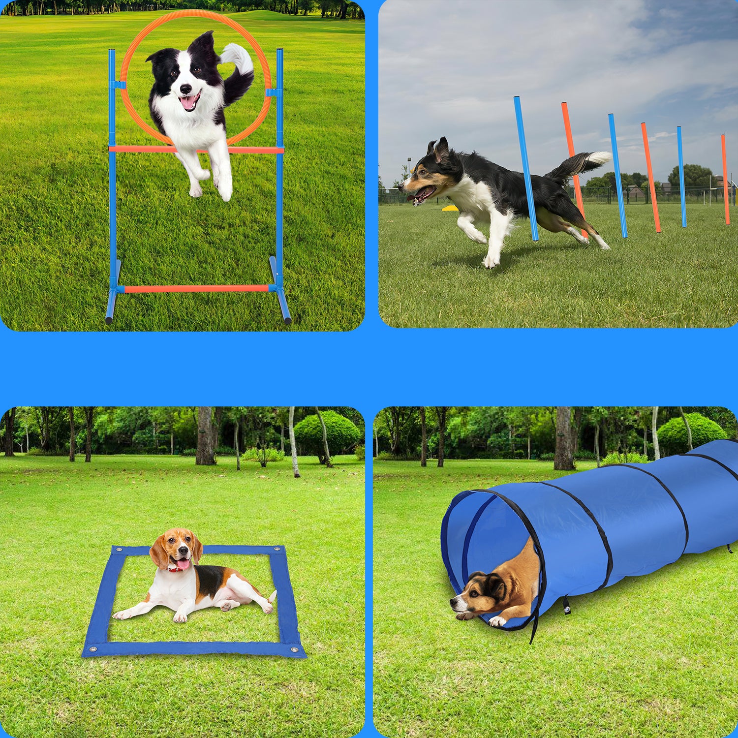 [Perfect Dog Agility Equipment Set] Create an optimal outdoor training course for your dog. The dog agility course set includes an agility tunnel, an agility hurdle, a jump ring, 8 slalom poles, a square break box, a ball, a whistle and a convenient carrying bag.