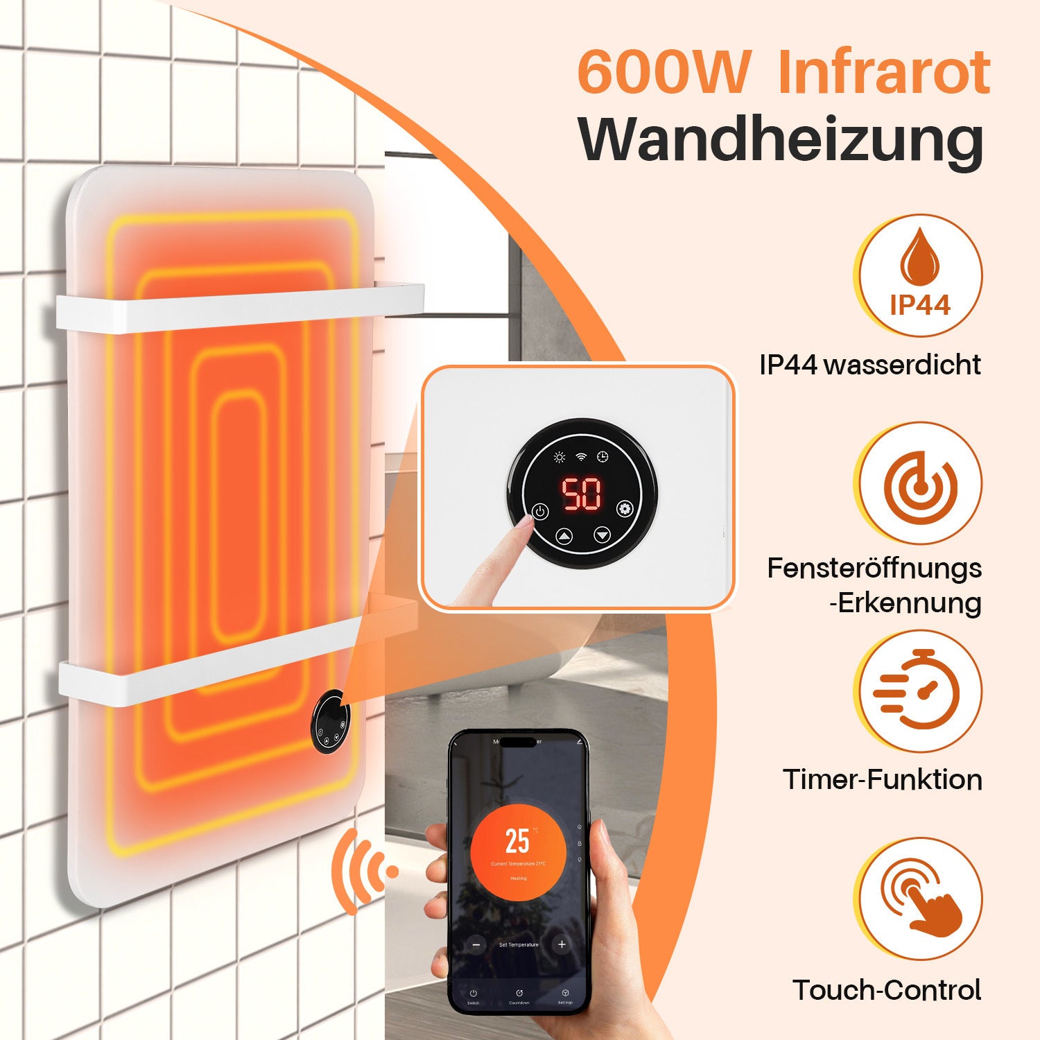 Zusätzlich sorgt der Infrarotheizung mit Handtuchhalter für Ihre Sicherheit mit einem doppelten Überhitzungsschutz, einer IP44-Zertifizierung, einer Fenstererkennungsfunktion und einem integrierten Timer, um den Betrieb noch sicherer und zuverlässiger zu gestalten.