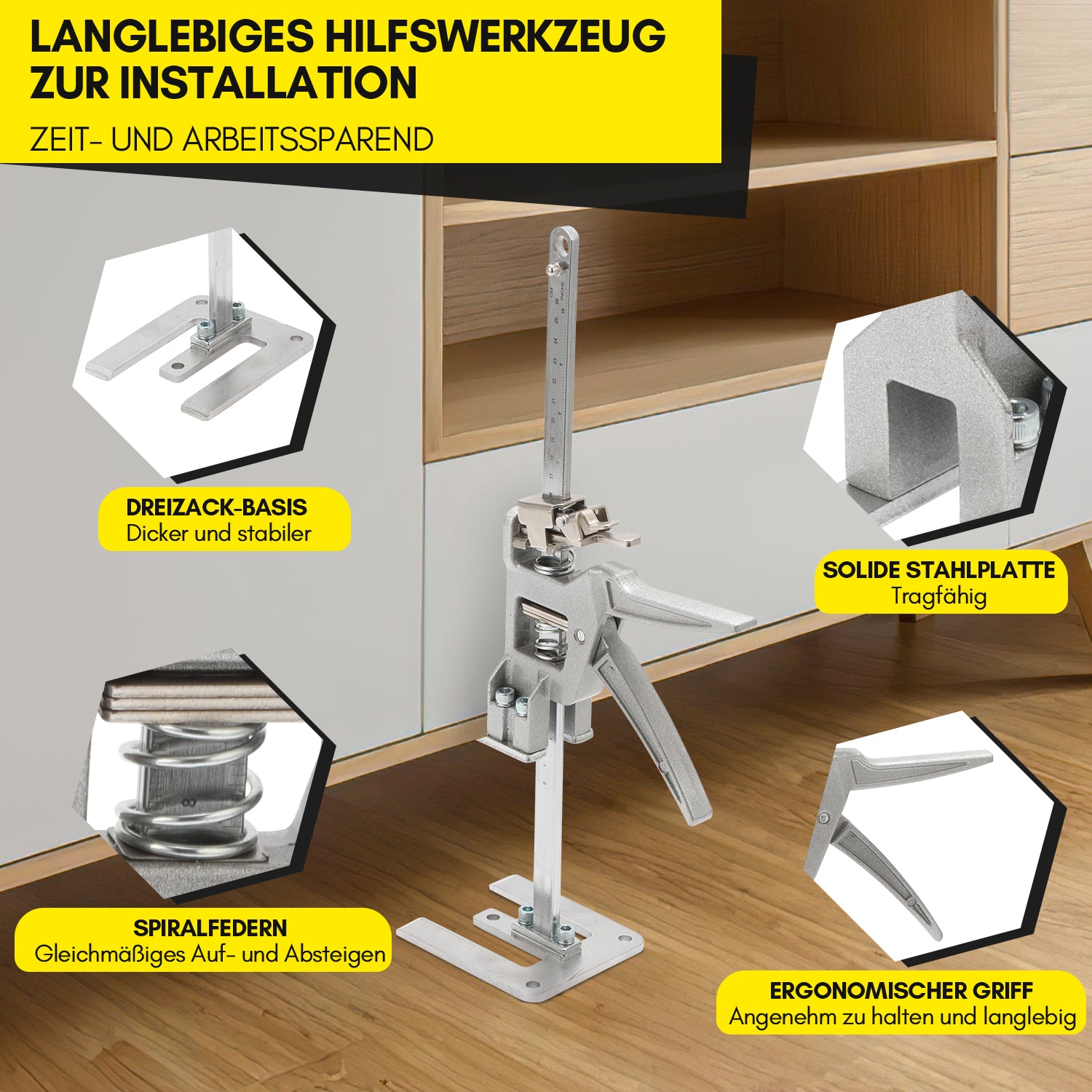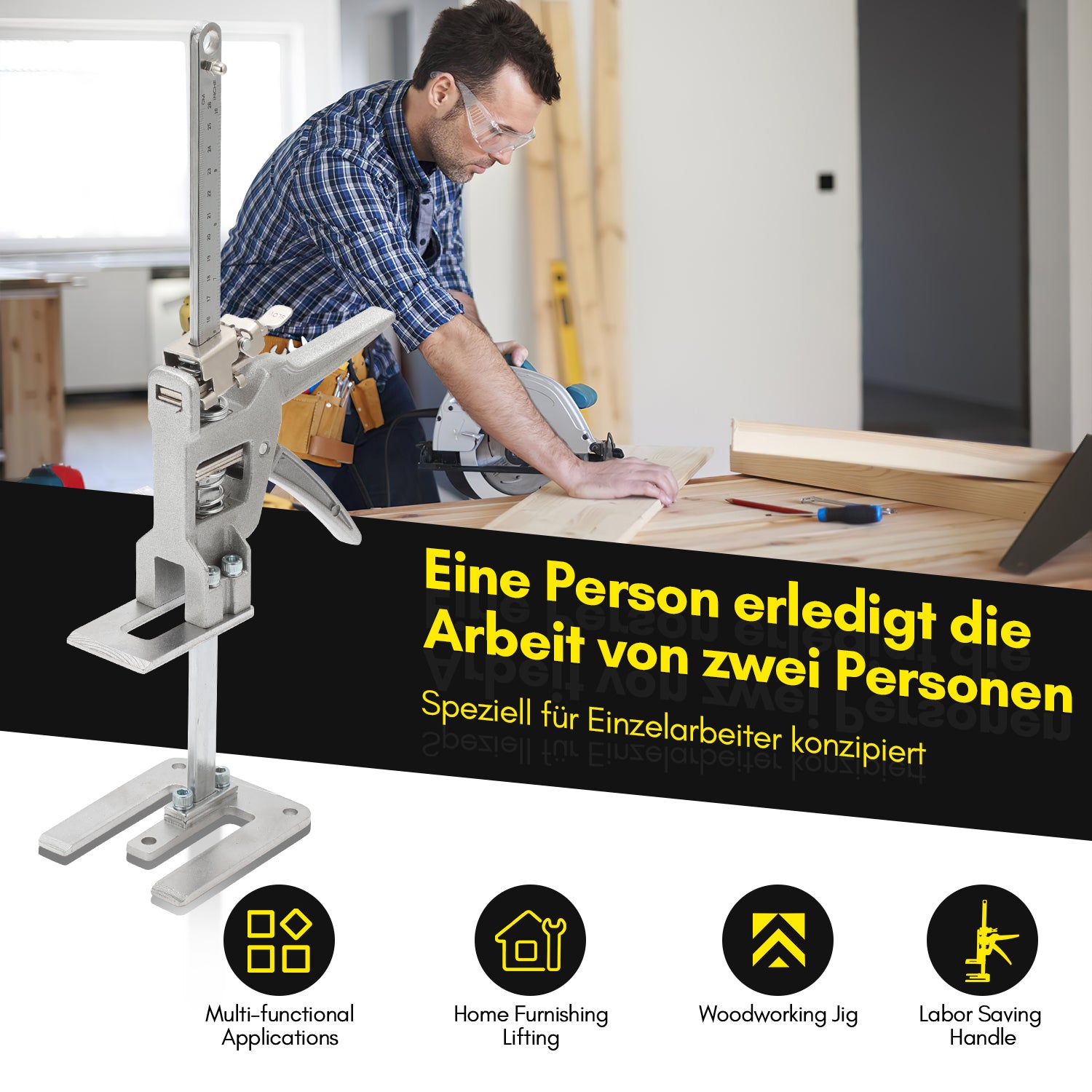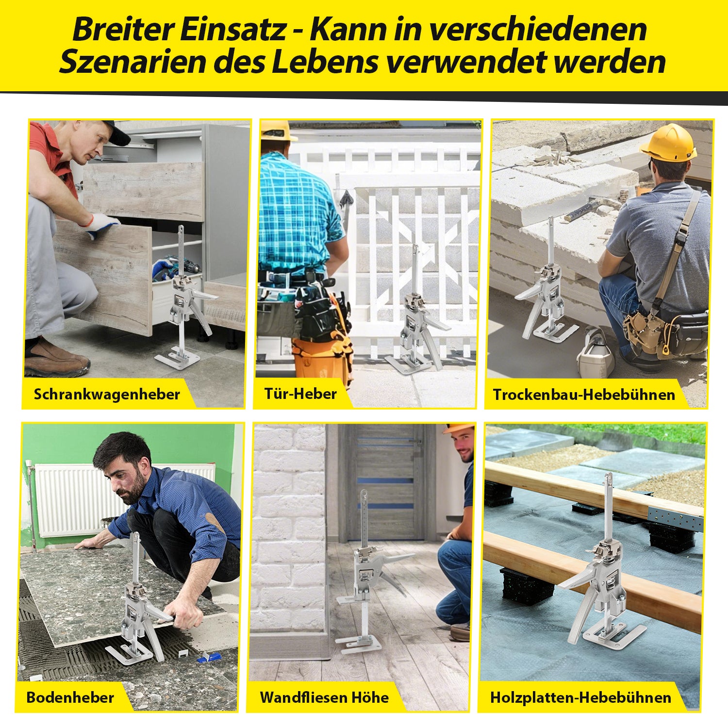 【Multifunktionaler Arbeitsarm】Der arbeitssparende Höhenversteller ist sehr geeignet für Tür- und Fenstermontage, Bodenbelag, Holzspleißen, Heben von Möbeln, Fliesen, Waren usw., Sperrholz, Arbeitsplatten, Rahmen, Veranden, Schränke.