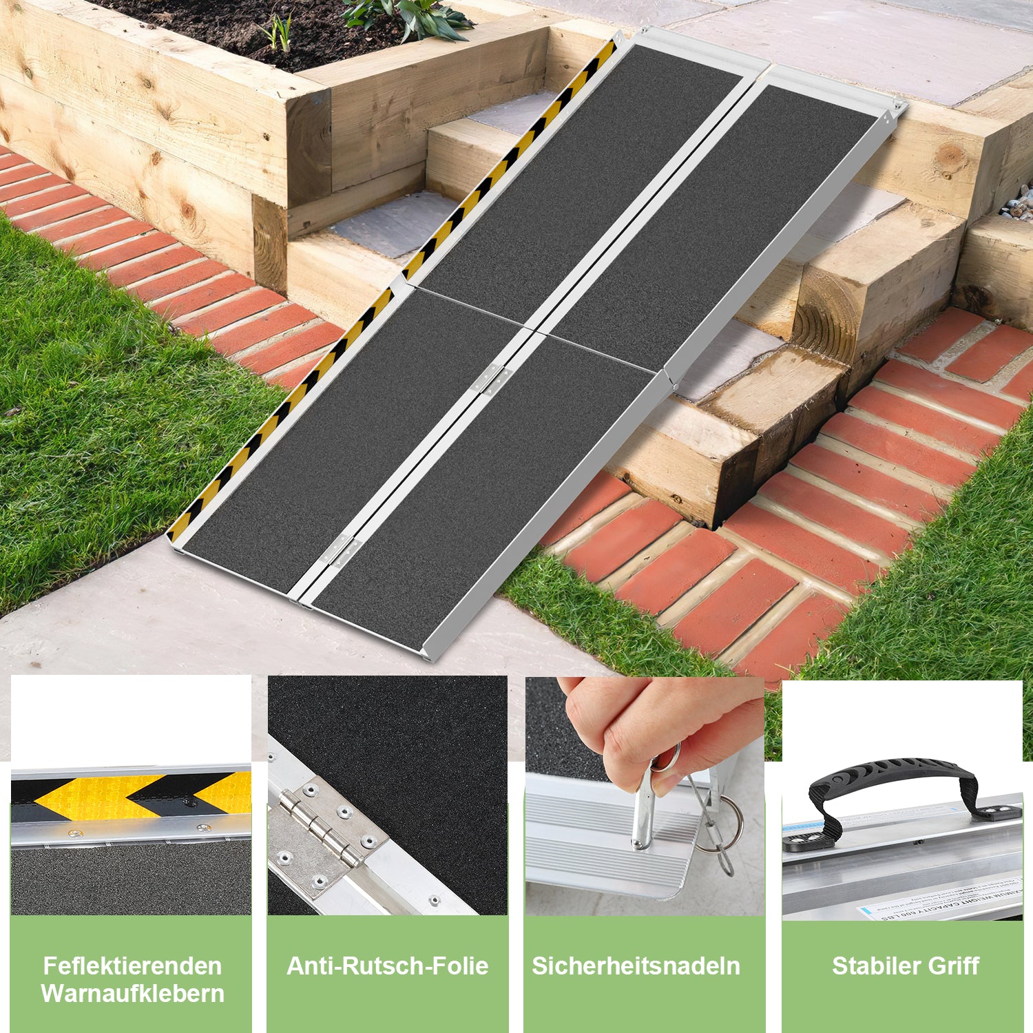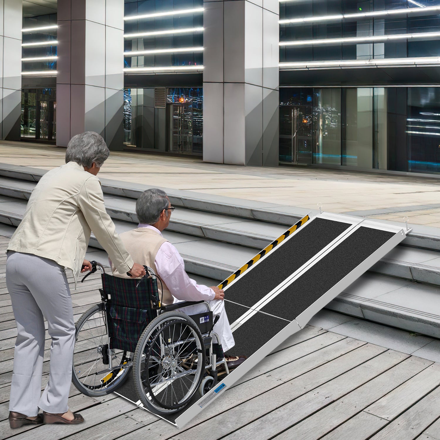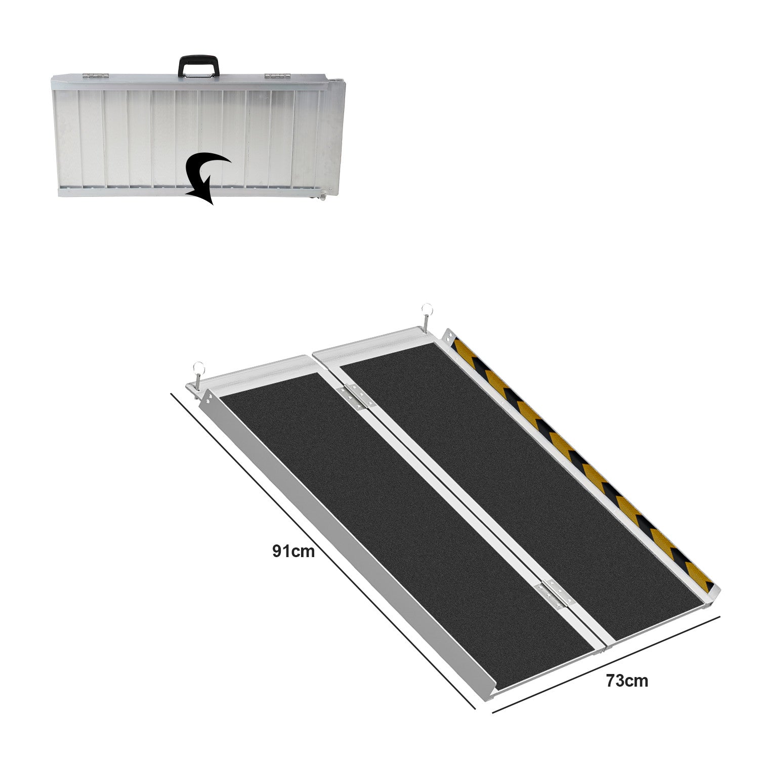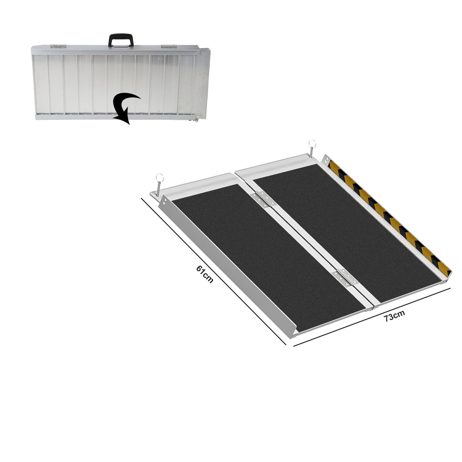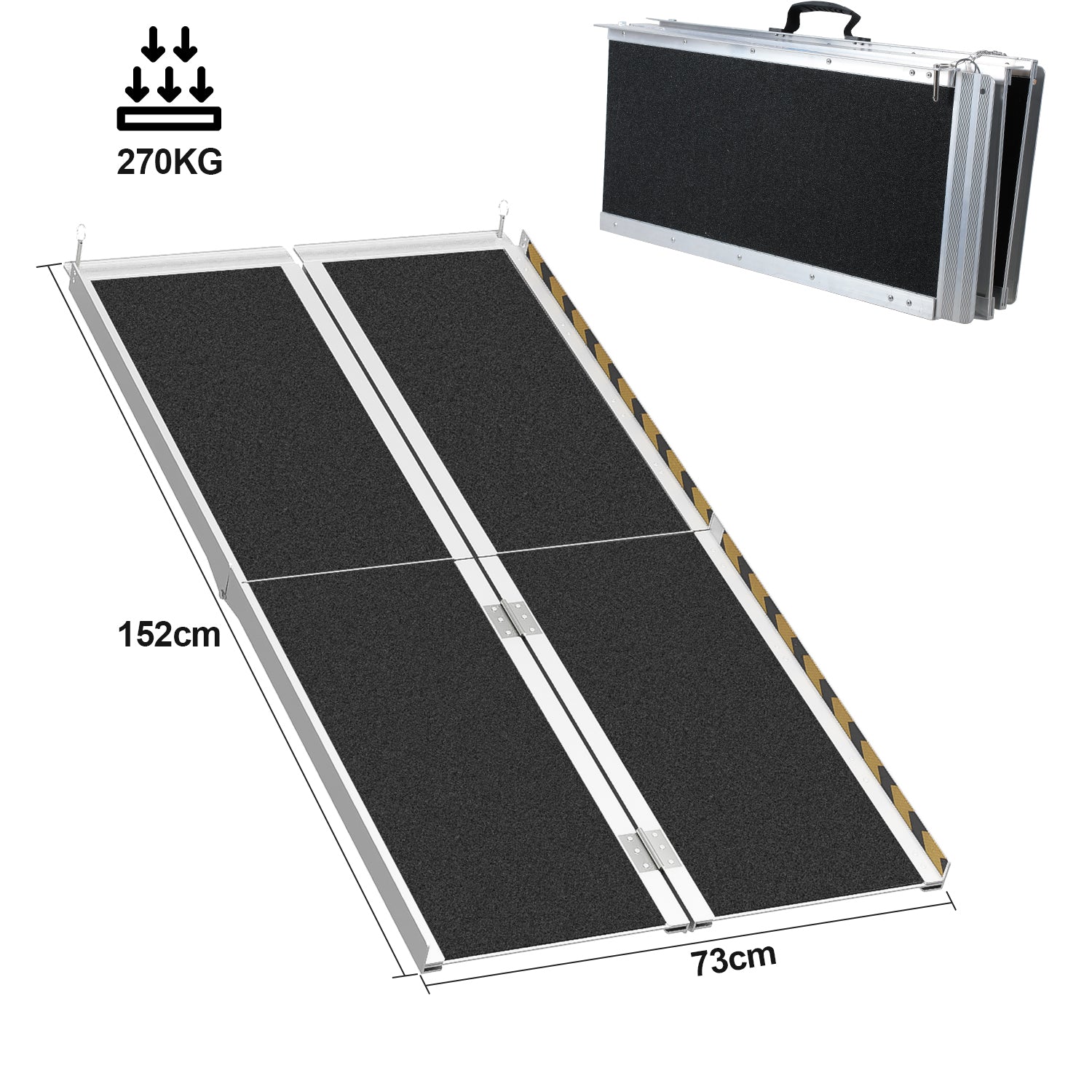 Lightweight wheelchair ramp with durable aluminum construction and a load capacity of up to 270 kg. Quick to assemble and ready to use, no installation required.
