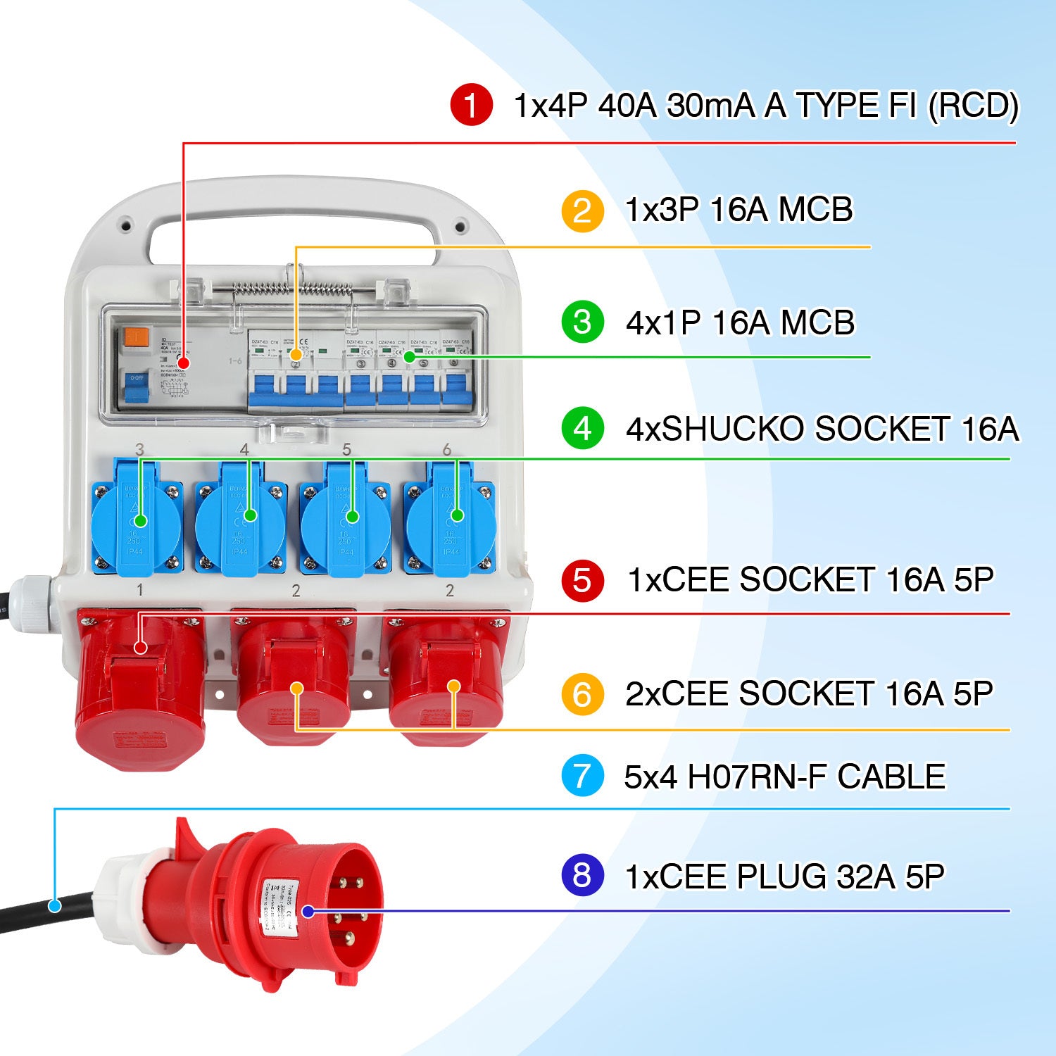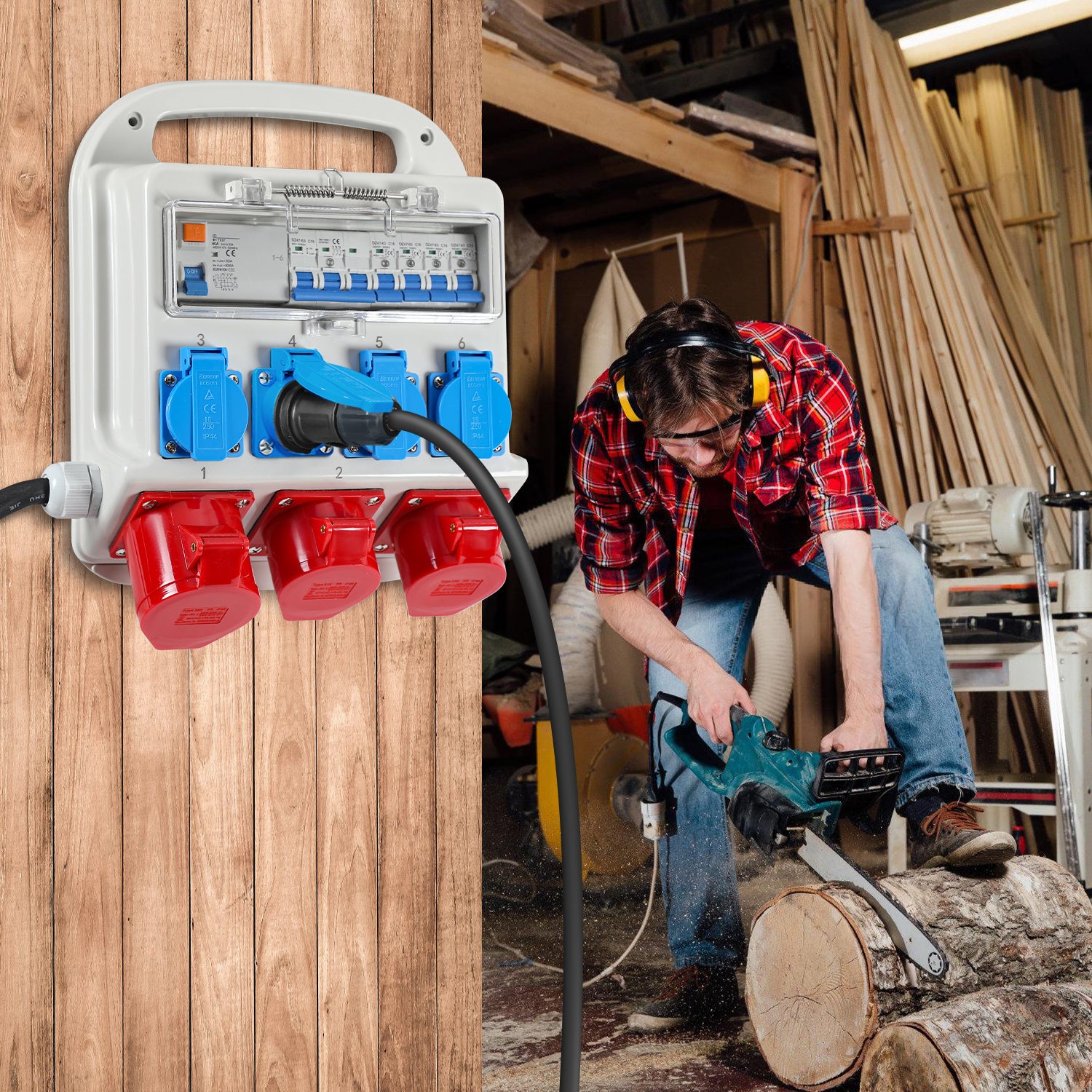 Material: Housing and mounting plate are made of durable special plastic and are of reliable quality. Wall distributor with residual current circuit breaker and fuses. Outlets are protected with the integrated residual current circuit breaker. Safety and safe use. In addition, the Schuko sockets are each individually protected with a 16A circuit breaker and the CEE 400V-16A sockets are protected together.