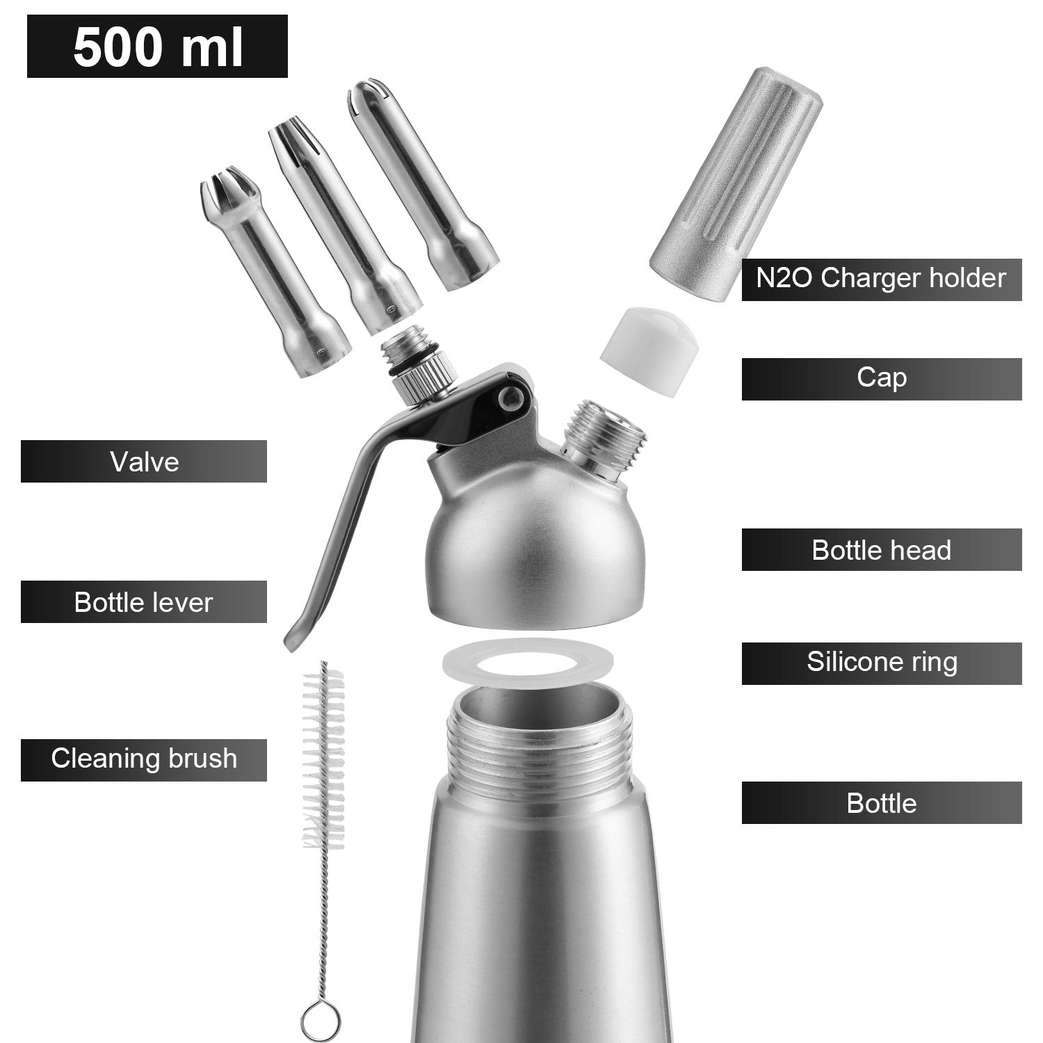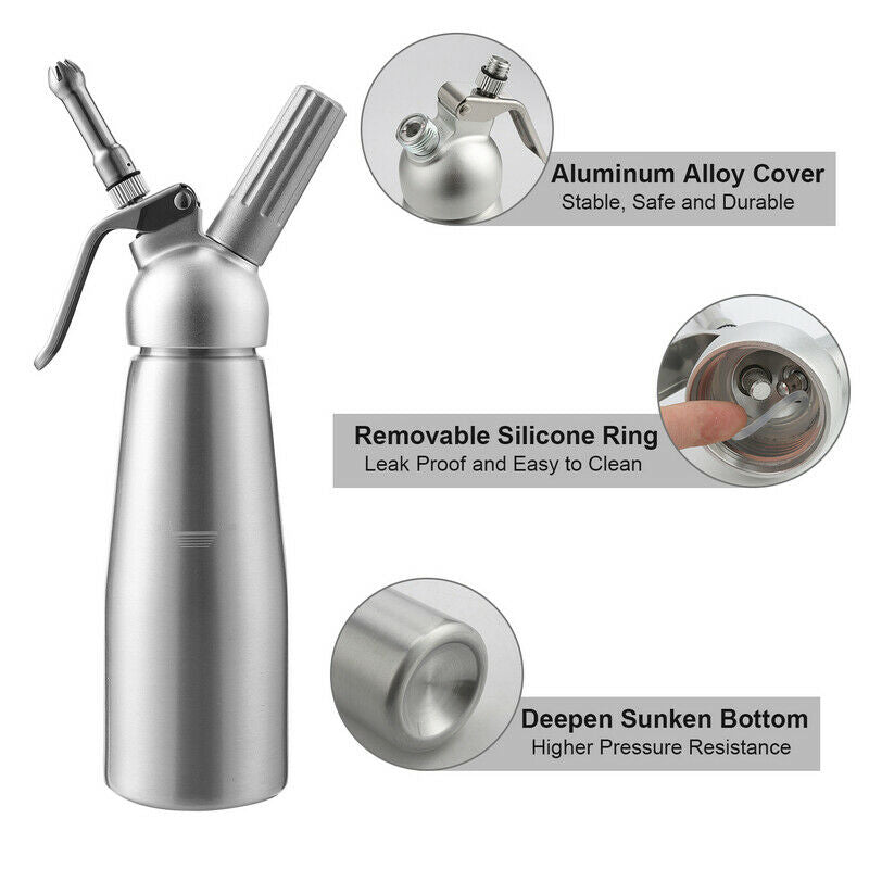 ❤Excellent quality and design - The cream foamer is made of high-quality aluminum alloy, strong and durable. The independent silicone sealing ring guarantees the tightness and prevents the cream from overflowing. It can be easily removed for cleaning after use.