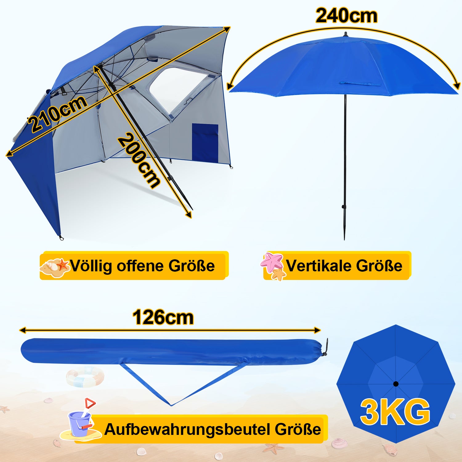 【2 in 1 parasol】The multifunctional umbrella can be used both on the beach and in the garden. An indispensable holiday companion for adults and children. Suitable for 2-4 people. The whole family can relax on the beach together. It is 200 cm high and has a diameter of 210 cm. Powerful umbrella protection from sun, rain and wind.
