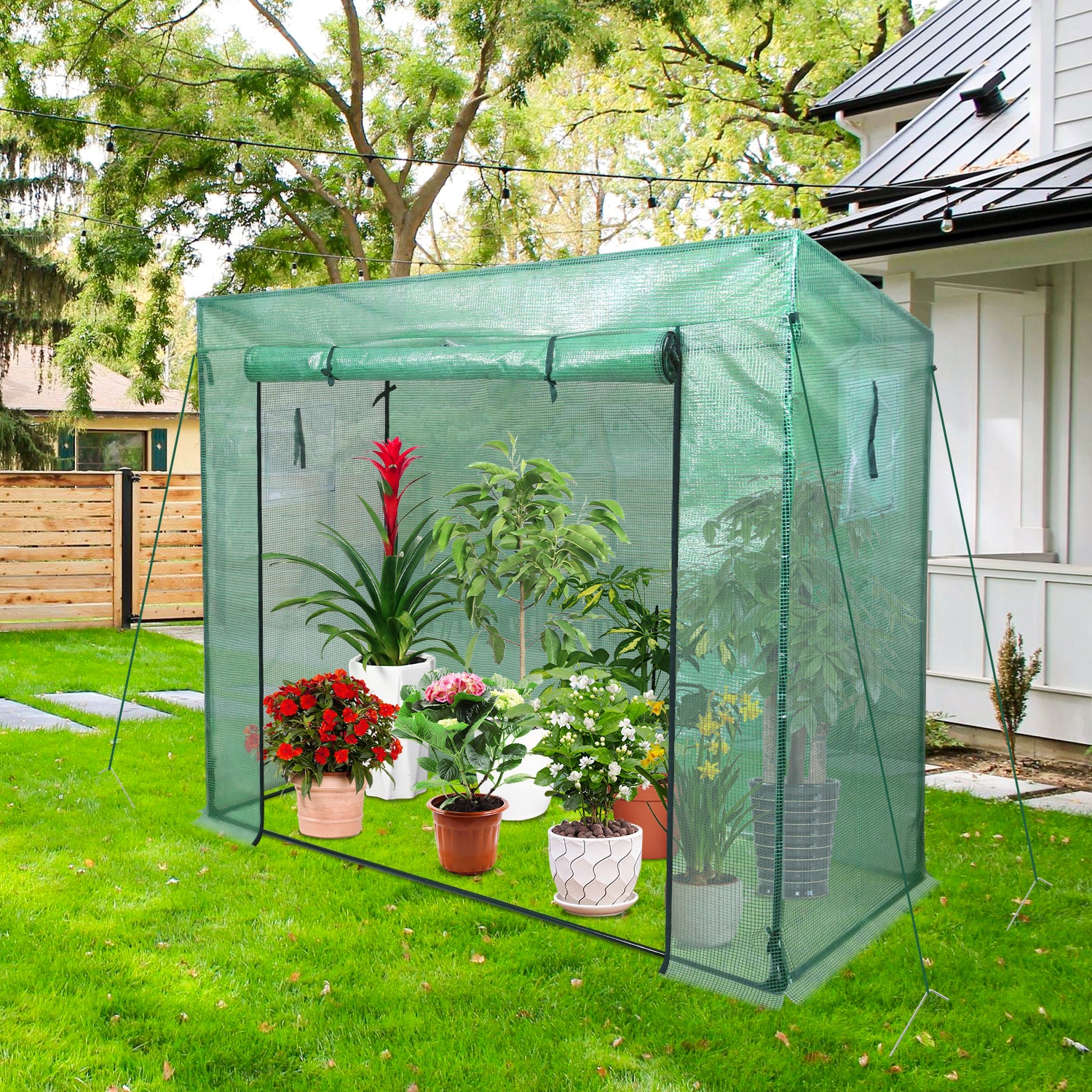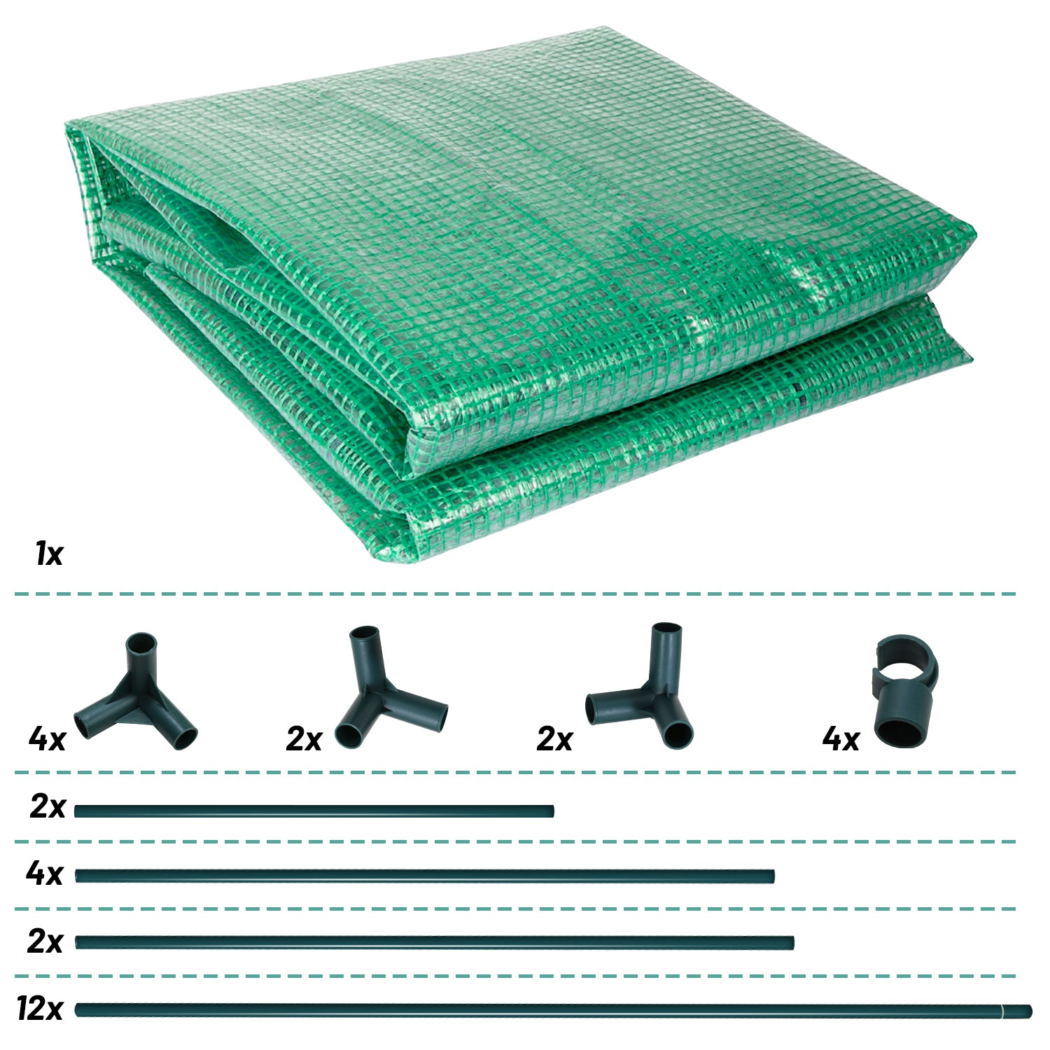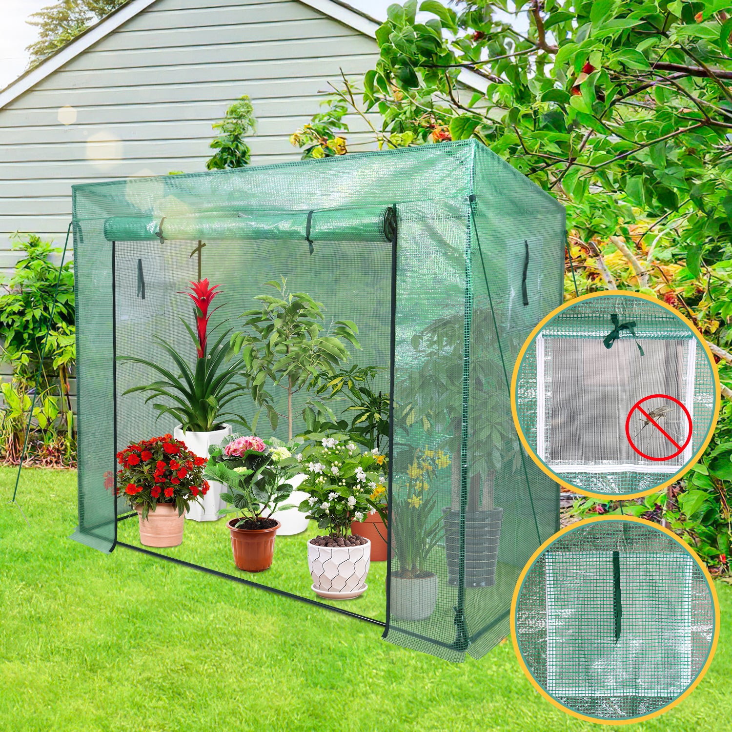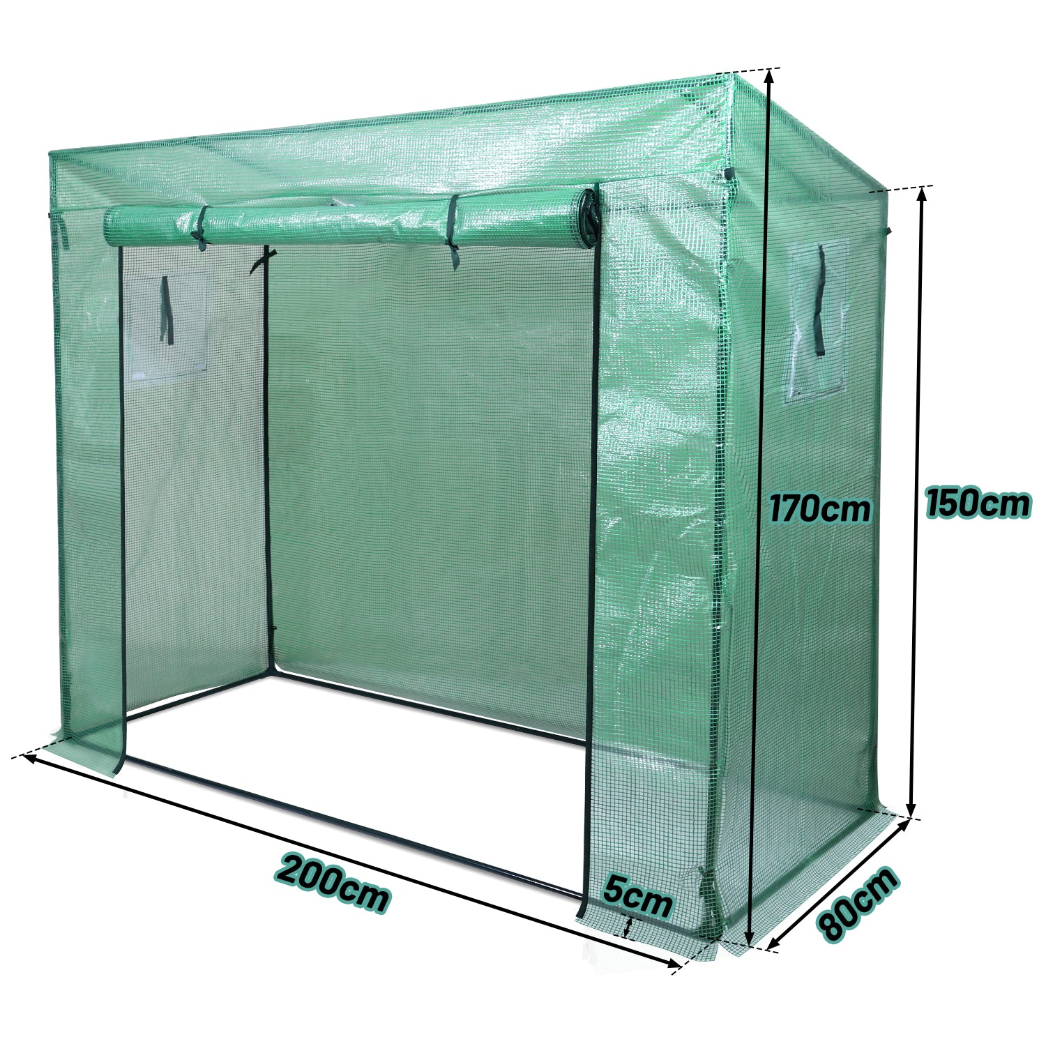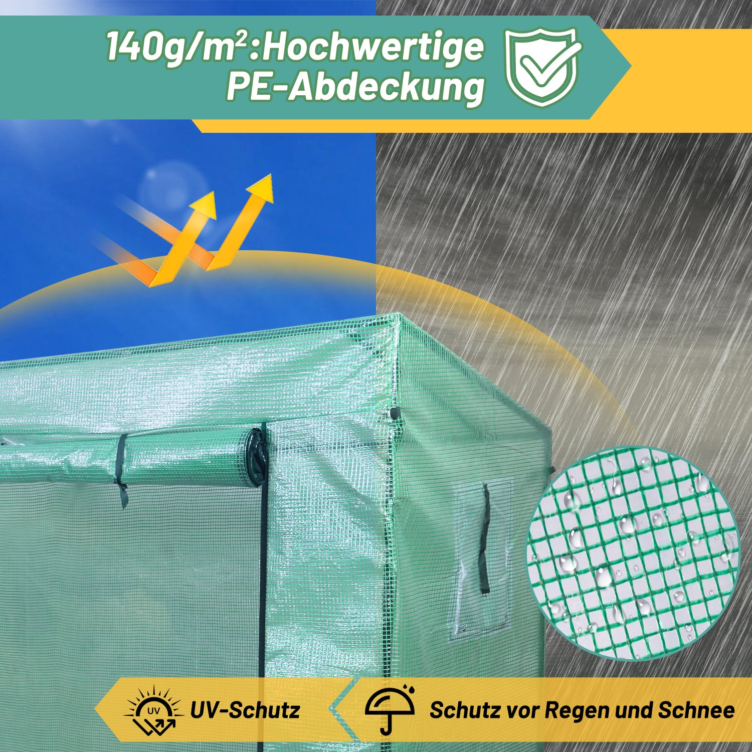 140 g / m² PE-Abdeckung mit Reißverschluss-Rolltüren und Fenstern: 100% wasserdicht, hervorragender UV-Schutz, die Sonne scheint durch die Abdeckung und bietet eine warme und feuchte Umgebung. Das begehbare Design bietet ausreichend Platz einen einfachen Zugang und gute Belüftung.