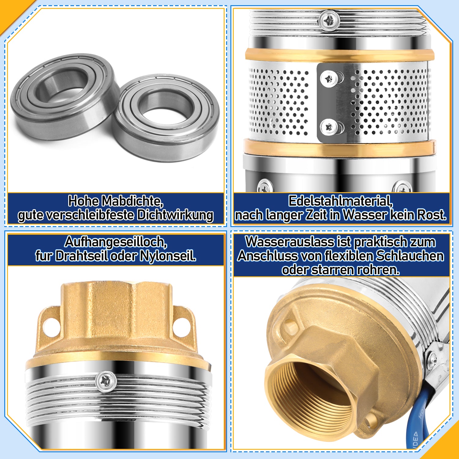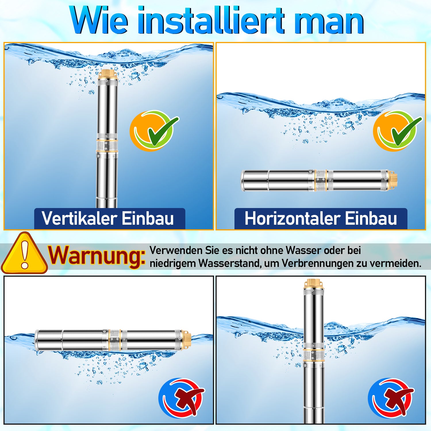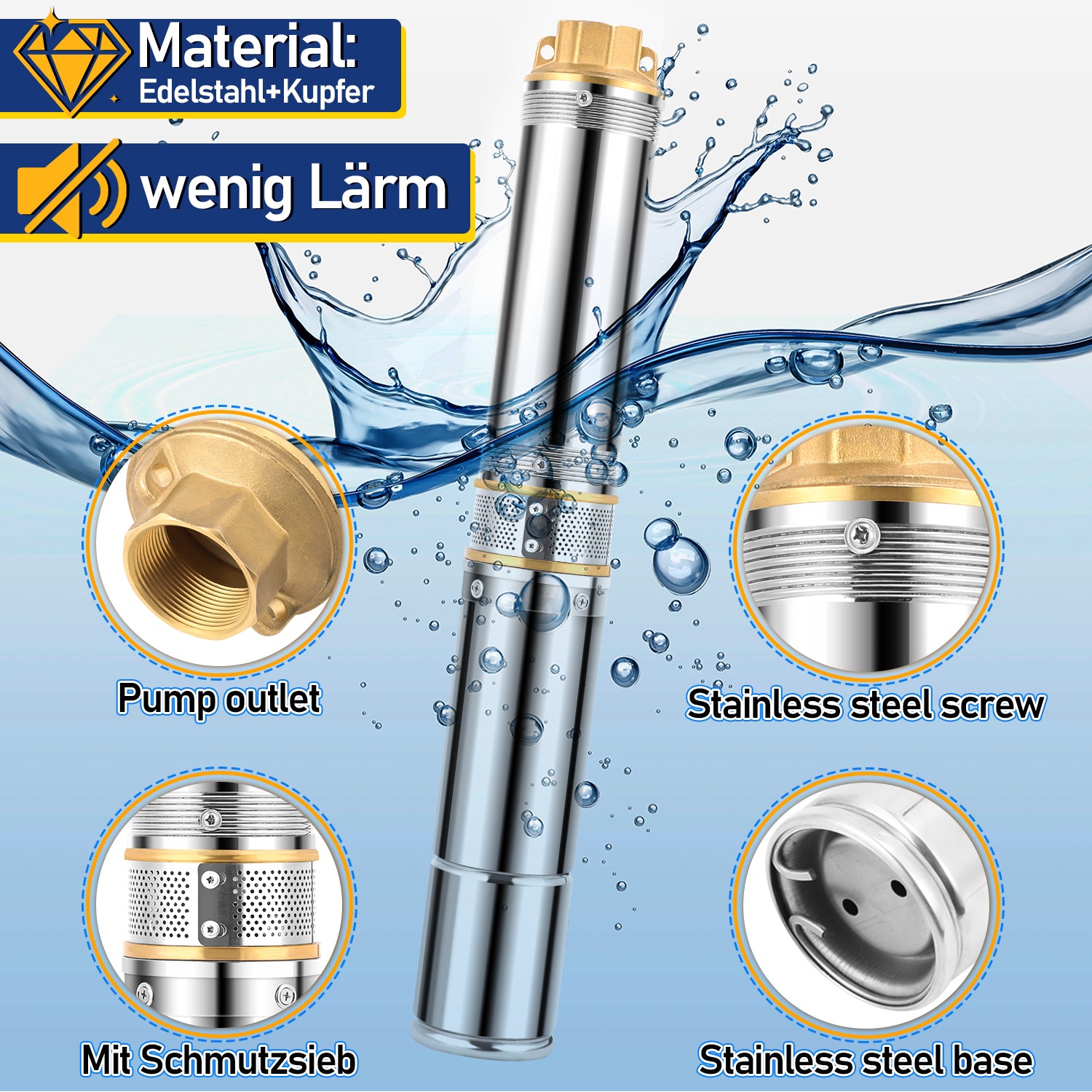 【Hochwertiges Material】Das Pumpengehäuse und der Gewindeanschluss bestehen aus rostfreiem Stahl, der stark und korrosionsbeständig ist. Er kann lange Zeit in Wasser getaucht und für die Wasserversorgung im Haushalt oder die Gartenbewässerung verwendet werden.