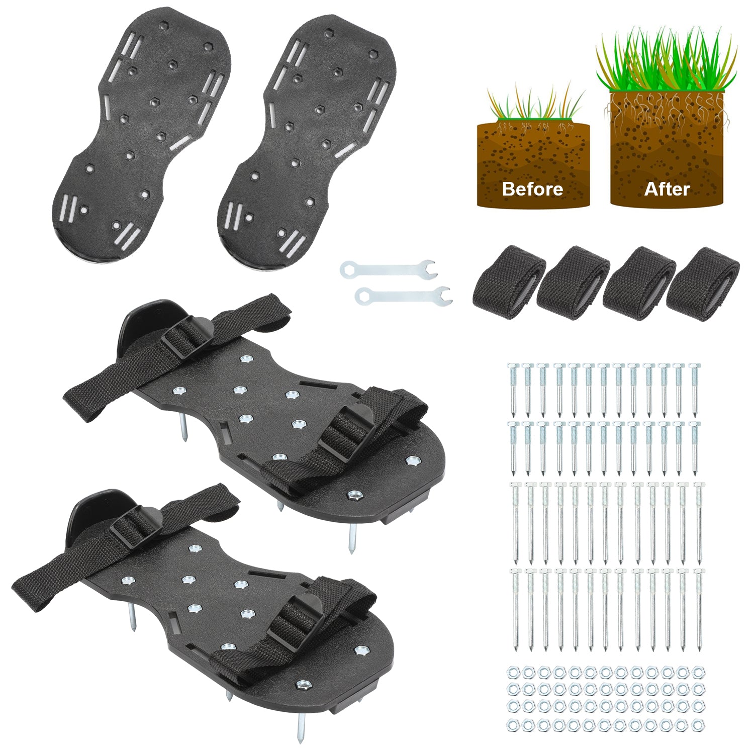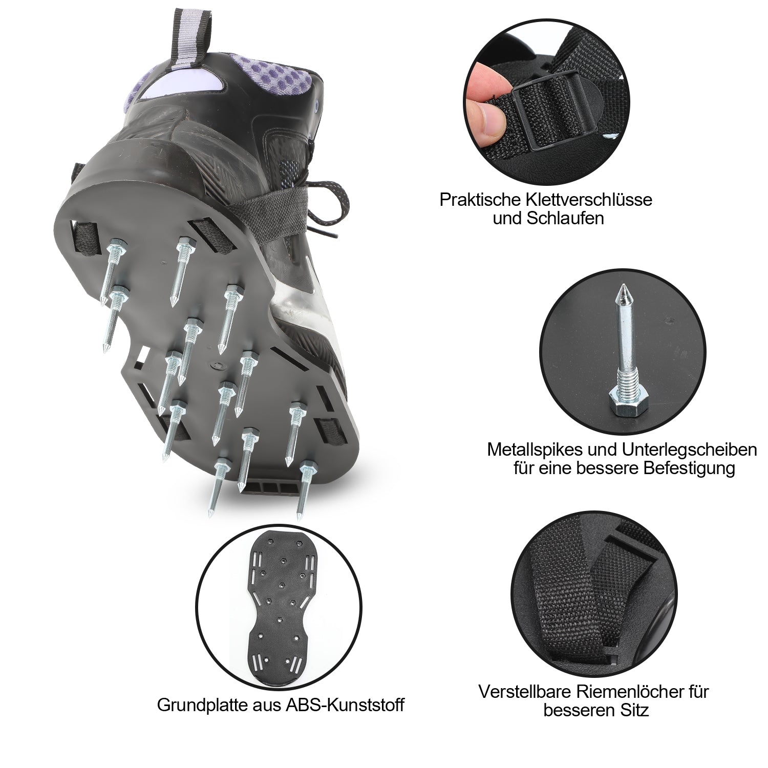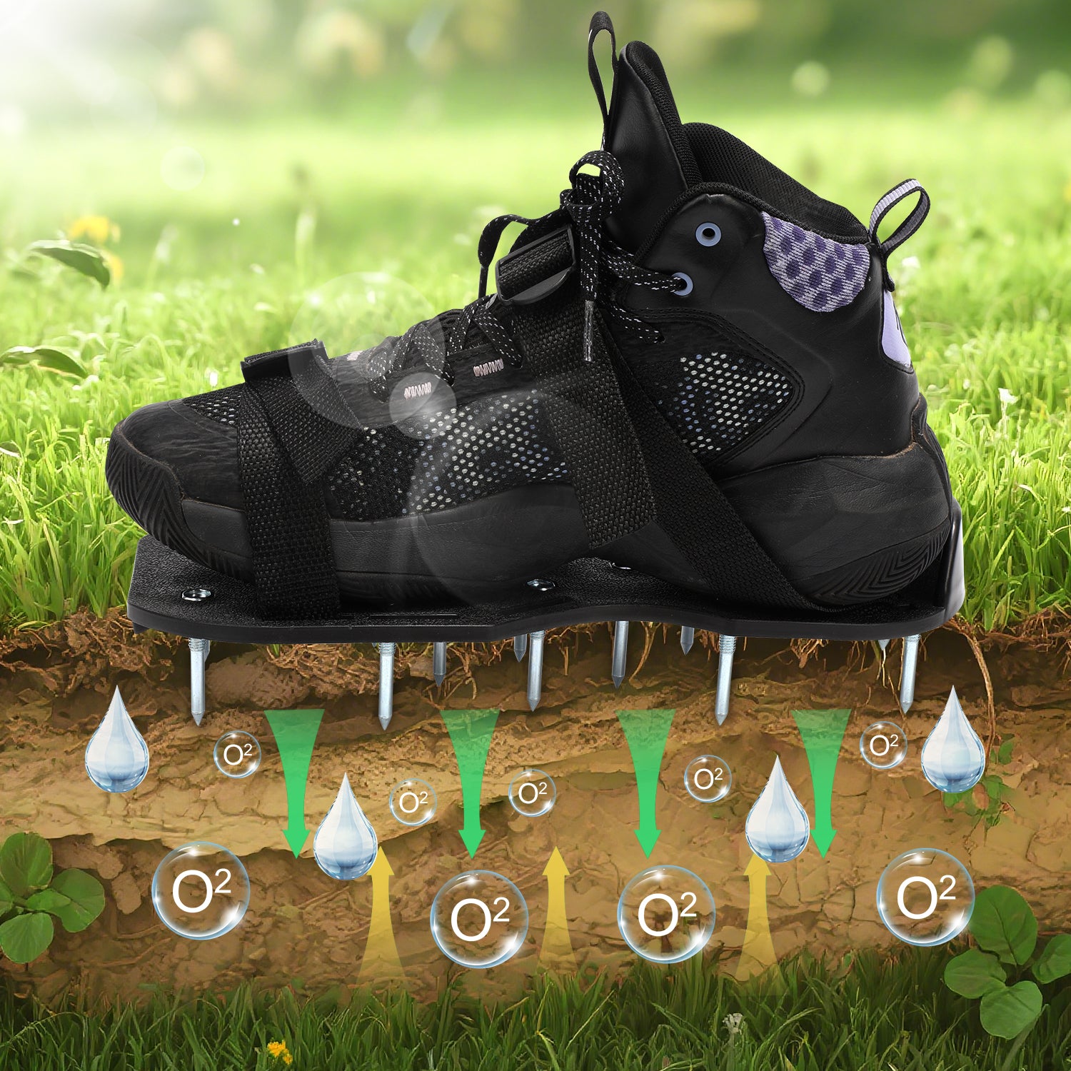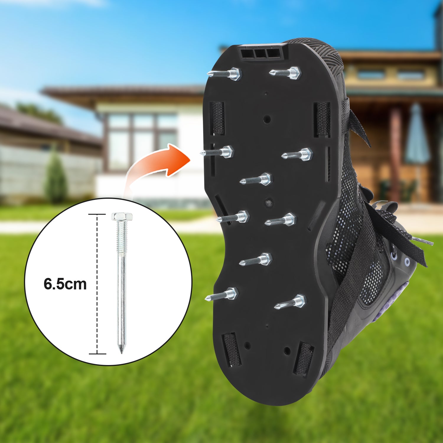 Die Nagelschuhe sind mit 26 Nägeln ausgestattet und zusätzlich mit 6,5cm langen Nägeln versehen, die effektiv in den Boden eindringen und tiefere Löcher schaffen, um eine effektive Belüftung des Rasens zu gewährleisten.