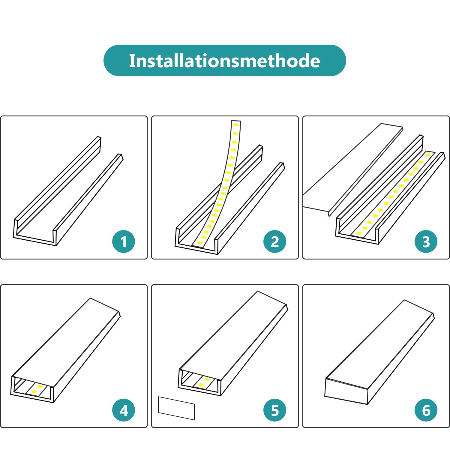 【U-Form - Universale passform】Einschließlich 10 Stk x1m U-förmigesAluminiumkanal und PC-Lampenschirm. 20x Lichtschlitzstopfen, 20x Befestigungsclips und 20x Befestigungsschrauben.