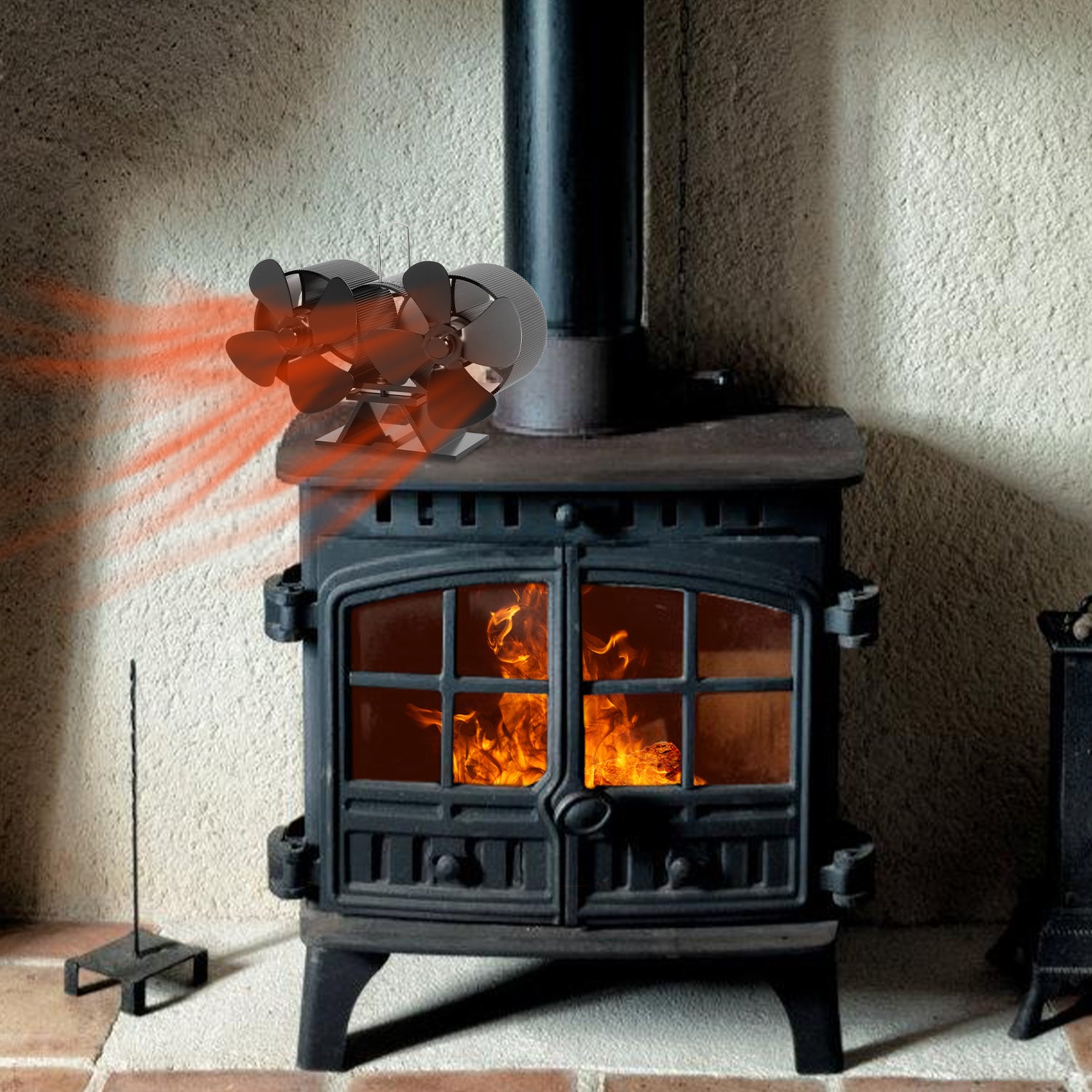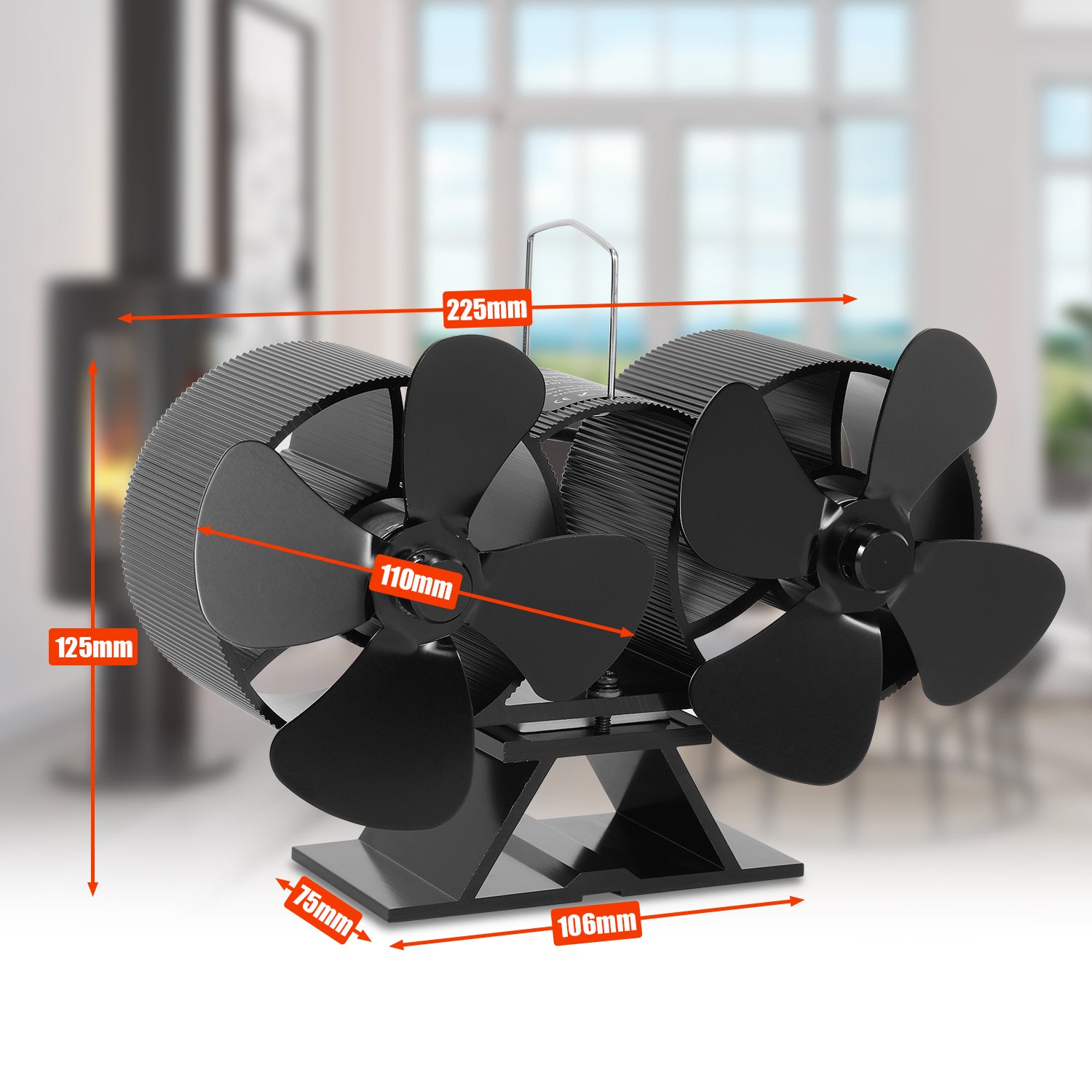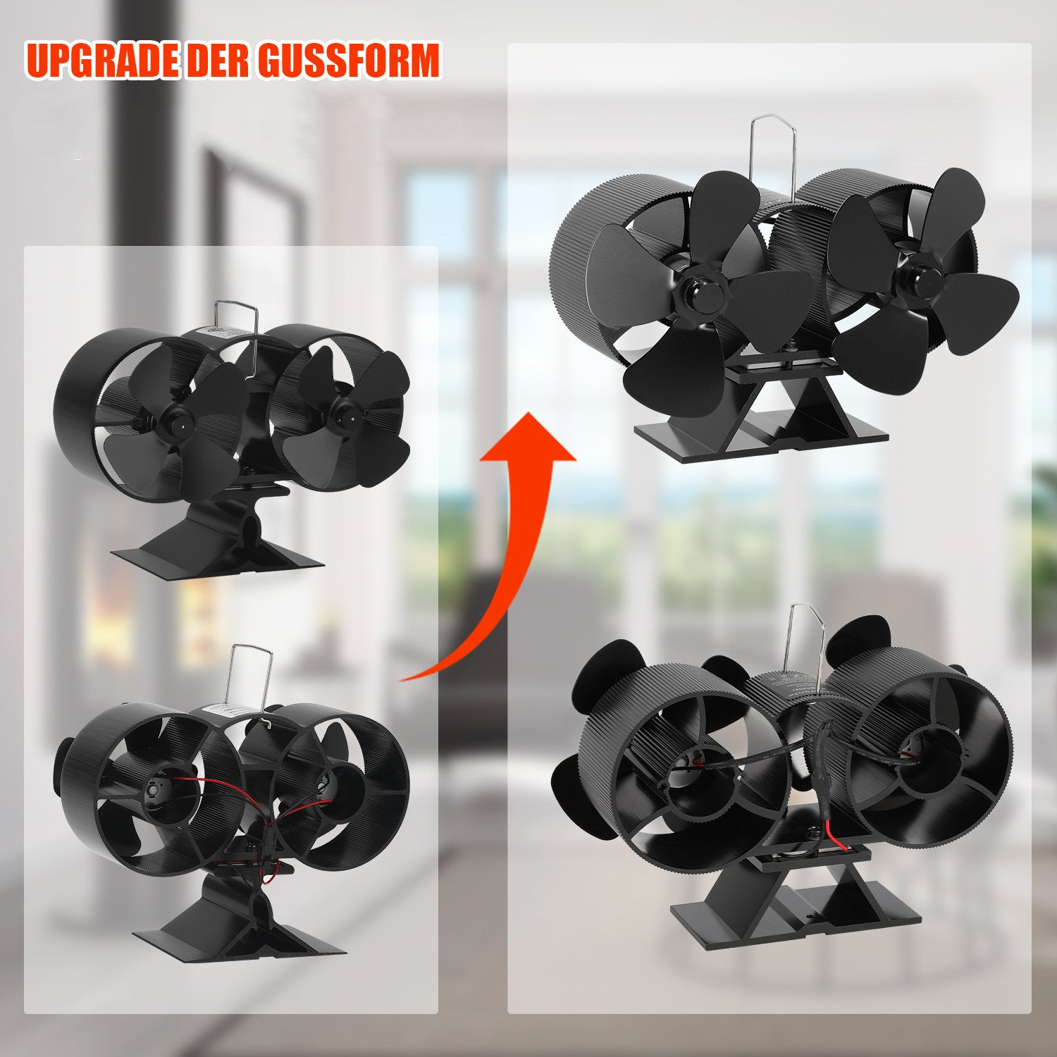 Höherer Luftstrom und Effizienz: Der Kaminventilator ist ein Doppelkopf-Design mit zwei Motoren und zwei 4-Blatt-Lüftern. Die Doppelkopfkonstruktion(große Klingen) verteilt die Wärme des Ofens effizienter und erhöht die Raumtemperatur schnell. Mit einem Umwälzvolumen von ca. 590-645 m³/h ist er ideal für große Flächen.