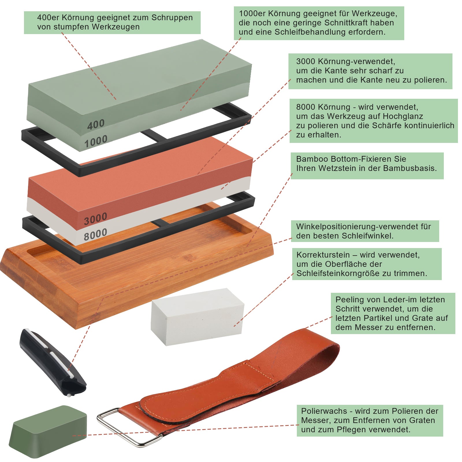 [Professionelles Schleifstein-Set] Der Schleifstein ist mit einem Schleifwinkelfixierer ausgestattet, der den perfekten Winkel und gleichmäßigen Druck während des Schleifvorgangs gewährleisten kann; (600) Der Korrekturstein macht die Oberfläche des Schleifsteins glatt; das Band kann das Werkzeug fein schärfen Grate.