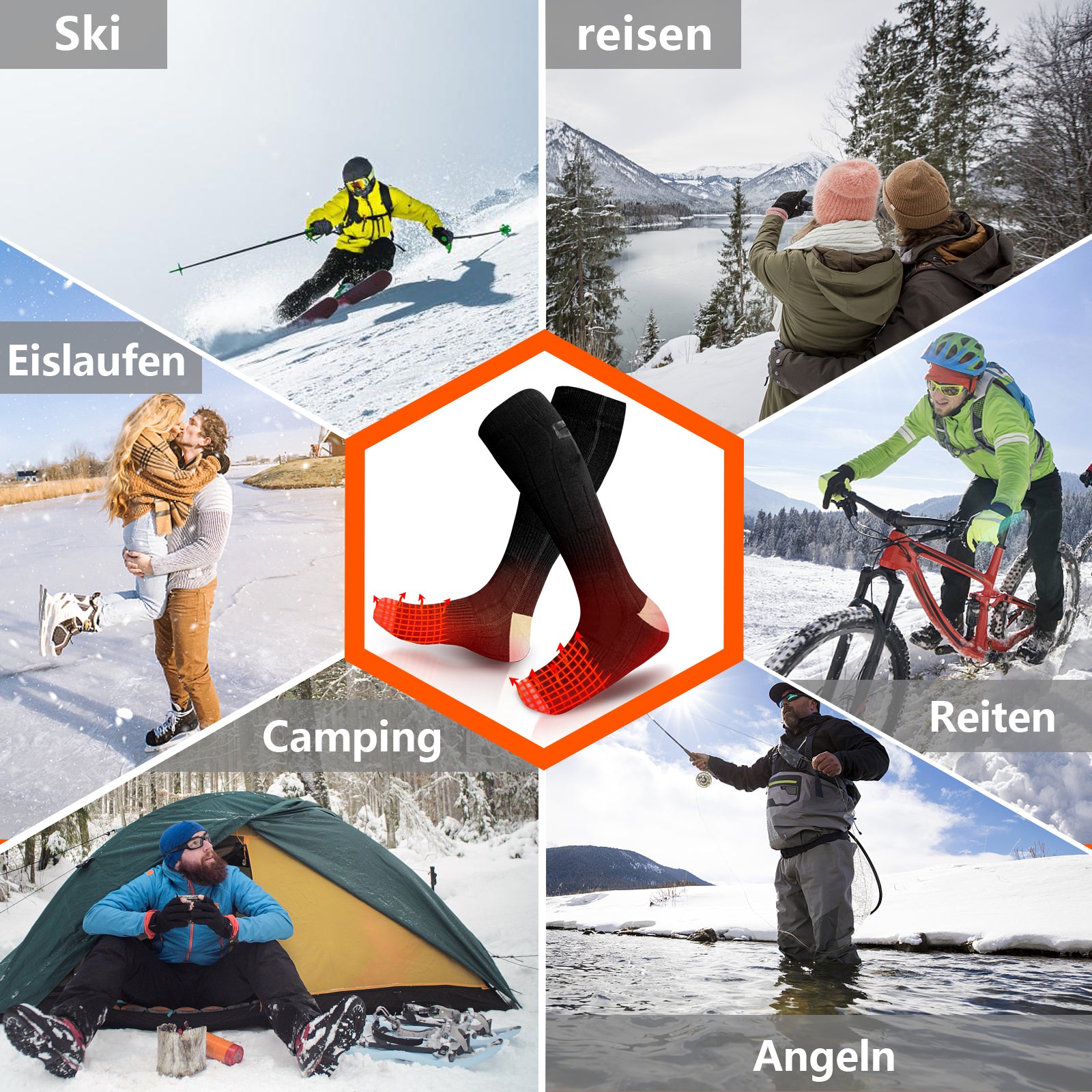 【Mehrszenenarbeit】Heizsocken eignen sich sehr gut für Outdoor-Sportarten im Winter wie Skifahren, Jagen, Camping, Eisfischen, Wandern usw.die Socken versorgen dich bei diesen extrem niedrigen Temperaturen mit Wärme, Gleichzeitig eignet es sich auch zum Warmhalten im Winter in Innenräumen, wie z.B. Büroarbeit, Ruhe zu Hause etc.