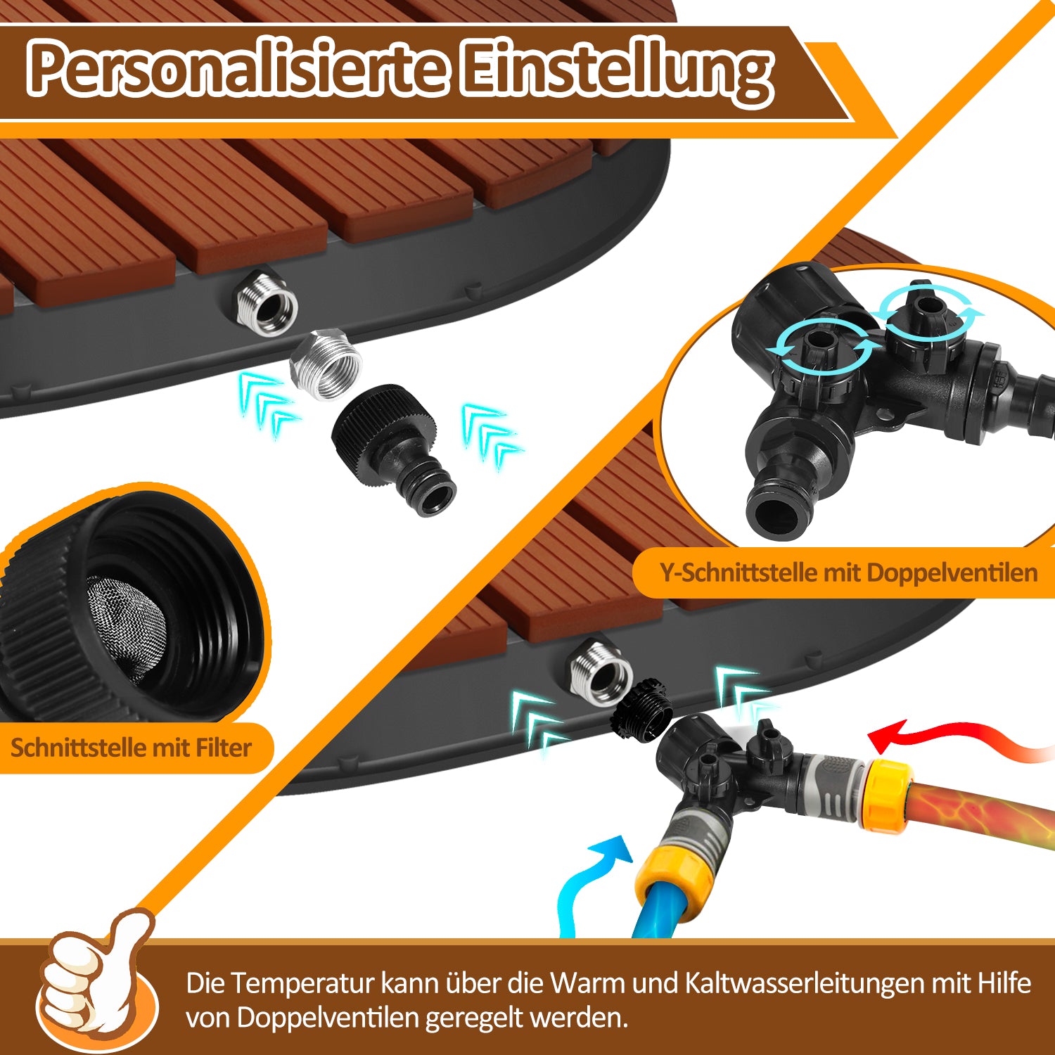 Einfache Installation: Die Bodendusche ist mit handelsüblichen Gartenschläuchen kompatibel und wird mit 2 Adaptern geliefert. Zusätzlich zum Wasserhahnanschluss mit Filter enthält sie auch einen vielseitigen 2-Wege-Y-Verteiler, der höheren Wasserdrücken standhält und den gleichzeitigen Anschluss von Warm- und Kaltwasser ermöglicht. Mit zwei separaten Ventilen können Sie den Wasserfluss unabhängig voneinander steuern, um die Wassertemperatur anzupassen.