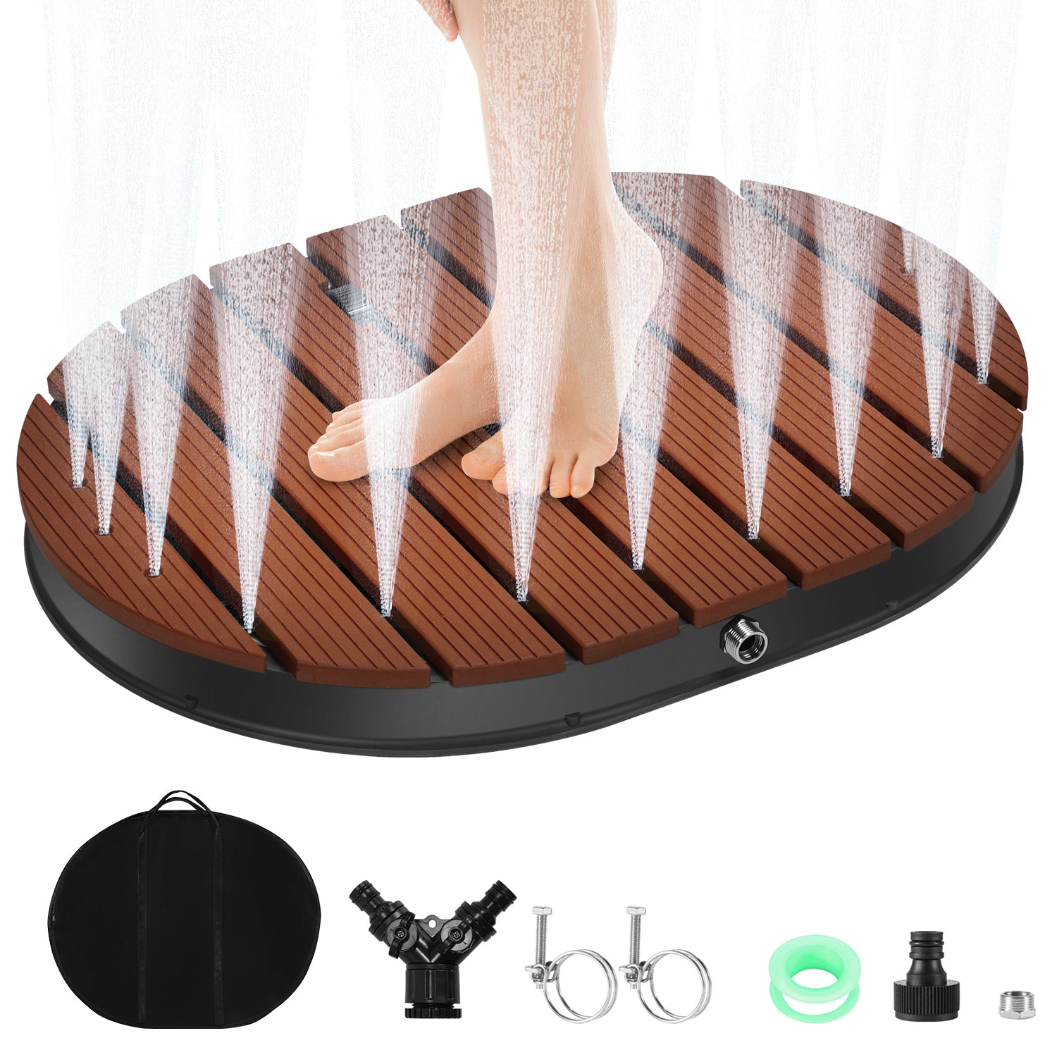 Hochwertiges Material: Die hochwertige Basis der Bodendusche sorgt für Robustheit und Langlebigkeit. Die wasserfeste und rutschfeste Bodenplatte in Holzoptik (WPC) widersteht UV-Strahlen, Feuchtigkeit und Schimmel. Mit ihrem schlichten, aber stilvollen Design ist sie die ideale Ergänzung für jede Außenbereich.