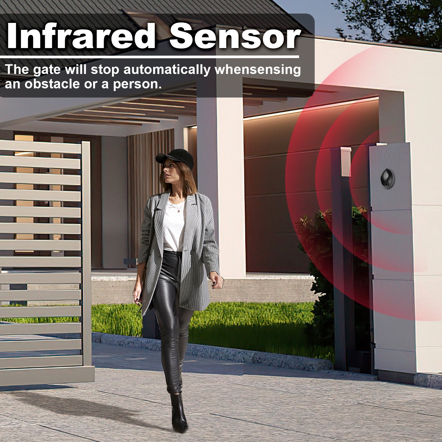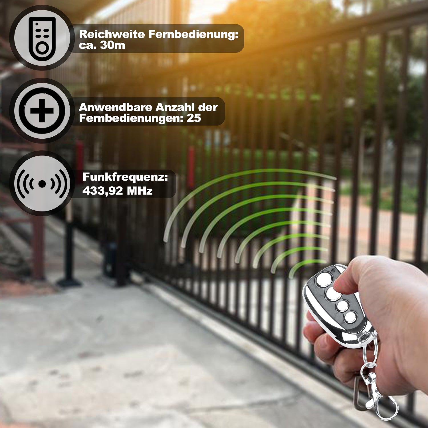 【Bequemer Betrieb】 Unser automatischer Schiebetoröffner verfügt über 2 drahtlose Fernbedienungen, einschließlich 4-Tasten-Fernbedienungen zum Öffnen, Schließen, Stoppen oder Verwenden des Fußgängermodus am Tor. Die Fernbedienungen können eine Reichweite von bis zu 99 Fuß (ca. 30 m) erreichen.