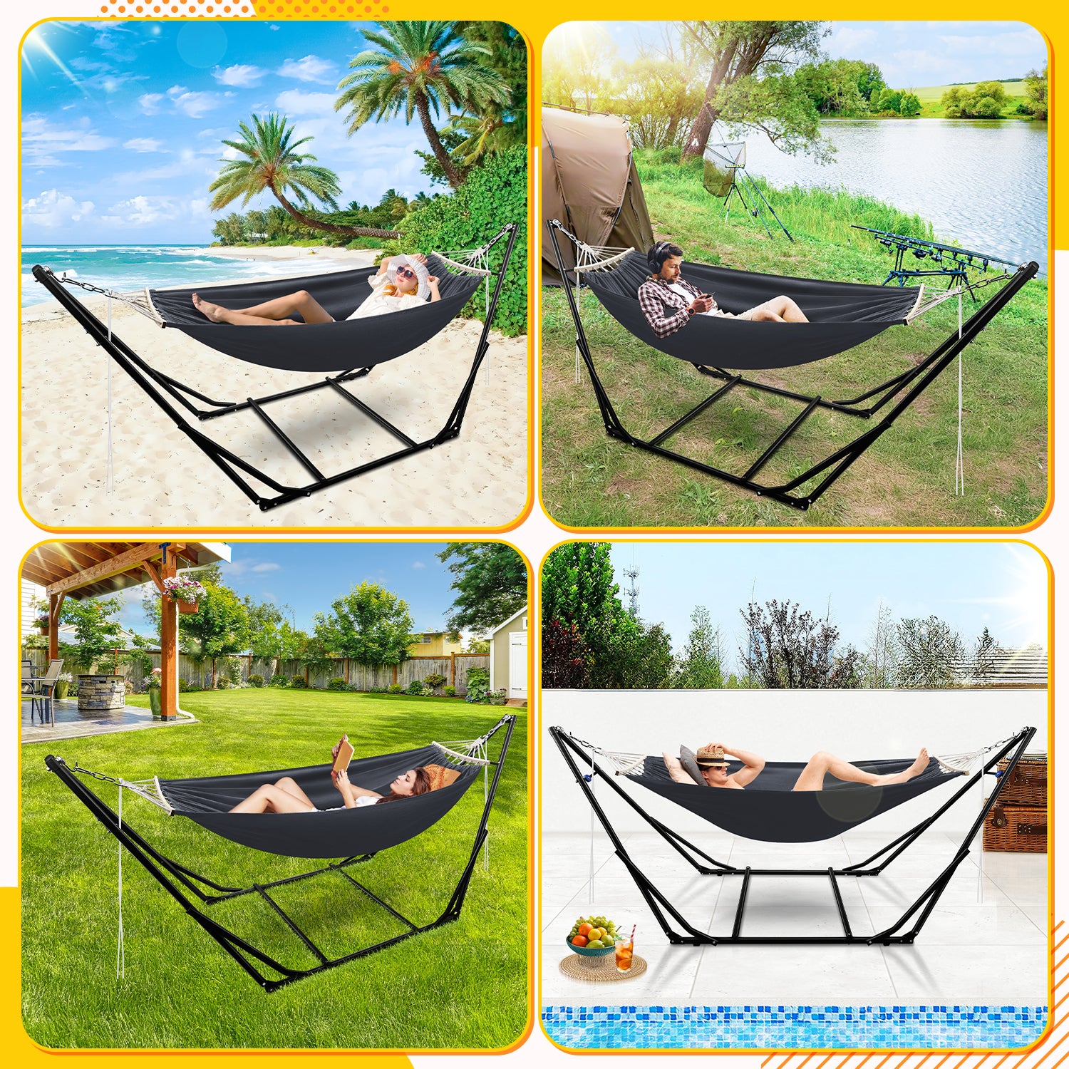 VIELSEITIGER EINSATZ:Die Hängematte mit Gestell kann sowohl drinnen als auch draußen verwendet werden. Sie können die Outdoor-Hängematte nicht nur in häuslichen Umgebungen wie Wohnzimmer, Schlafzimmer und Balkon, sondern auch am Strand, im Garten und beim Camping verwenden.