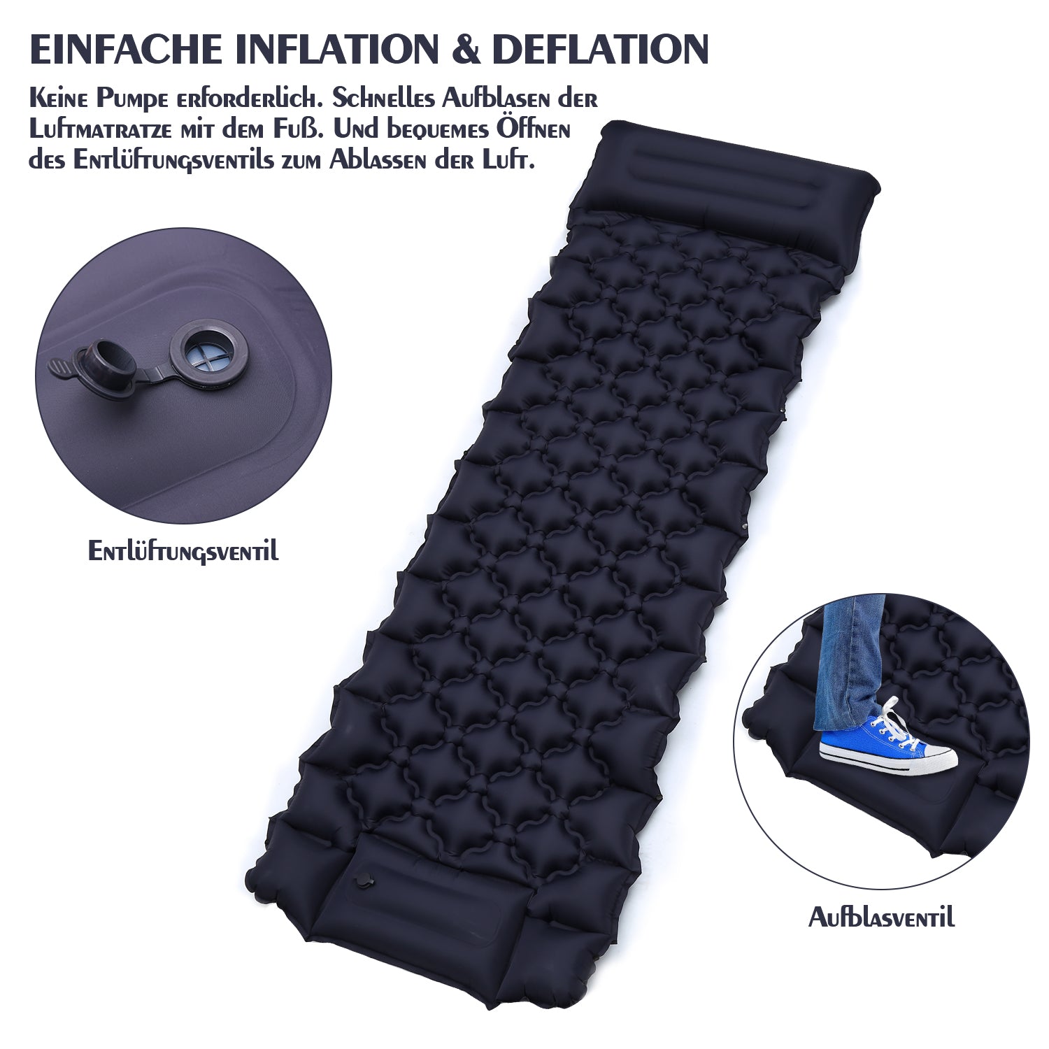 Verbessertes Aufblasventil: Camping Isomatte Stempel auf dem Schlafkissen, um es in einer Minute vollständig aufzublasen, was 40%-50% Aufblaszeit spart, Durch den getrennten Lufteinlass und -auslass bietet unsere Isomatte eine bessere Dichtigkeit;Mit Antileckfolien in den Ventilen müssen Sie sich keine Sorgen um einen Luftaustritt machen! Auch leicht zu entleeren - einfach den Entlüftungsstopfen herausnehmen.