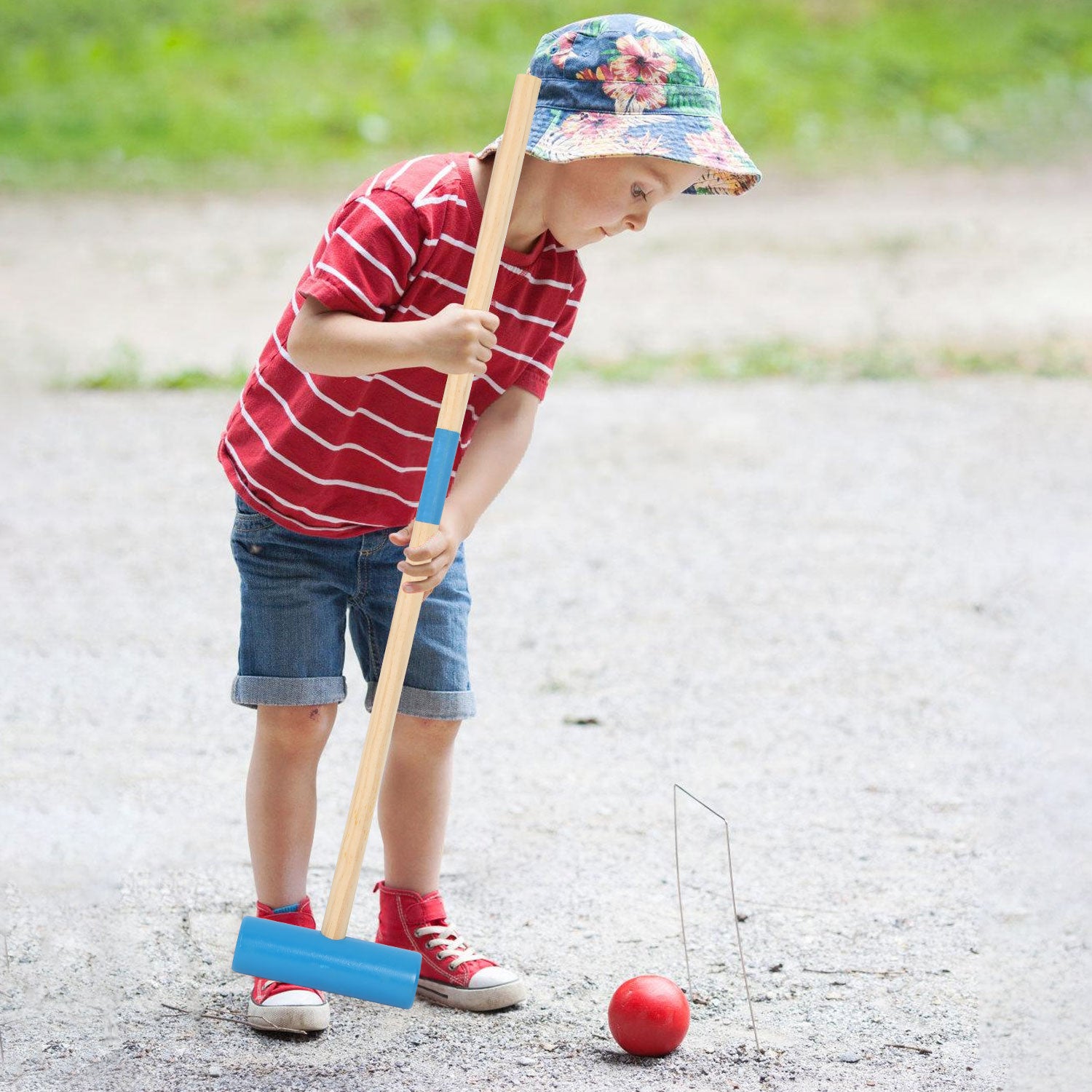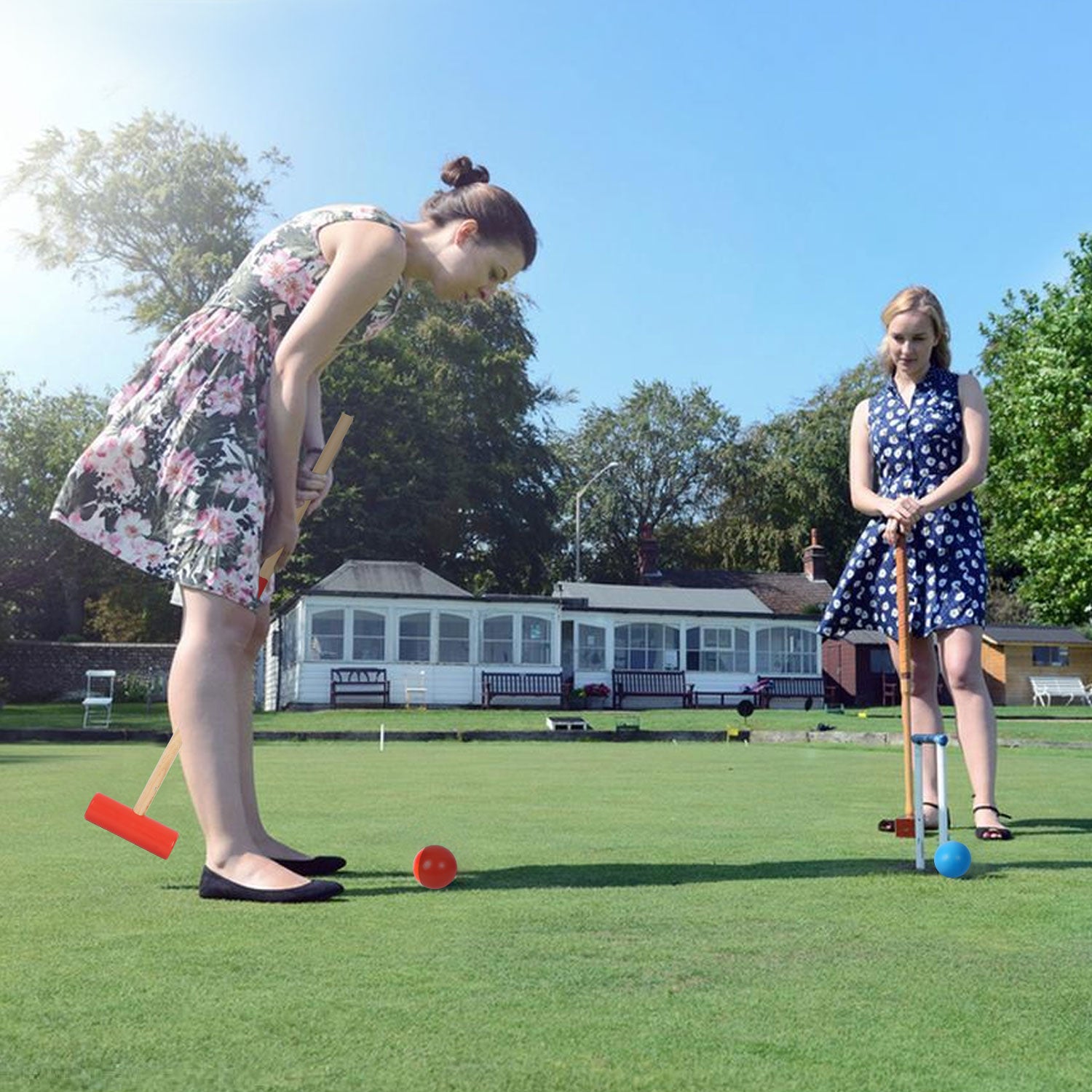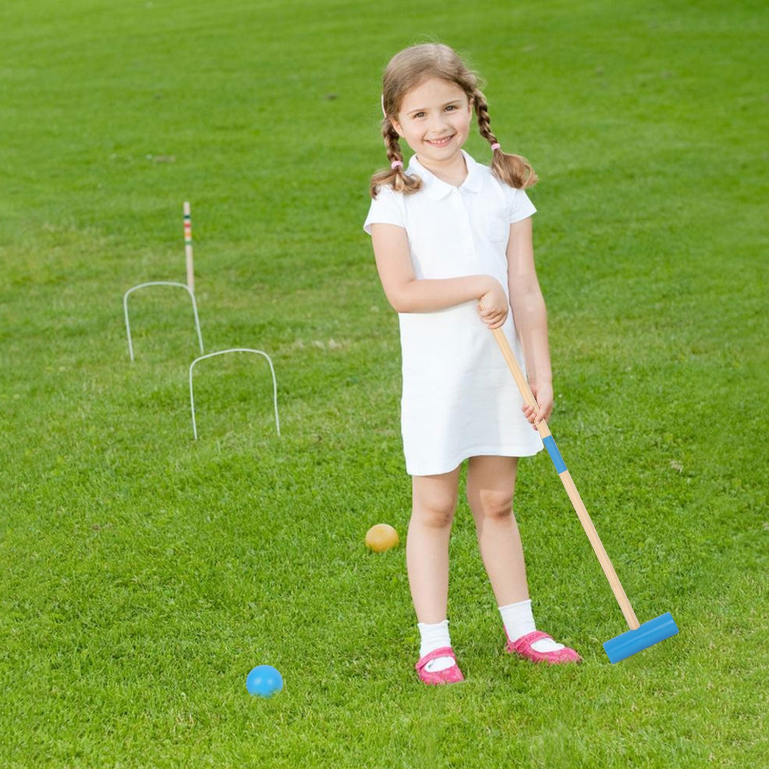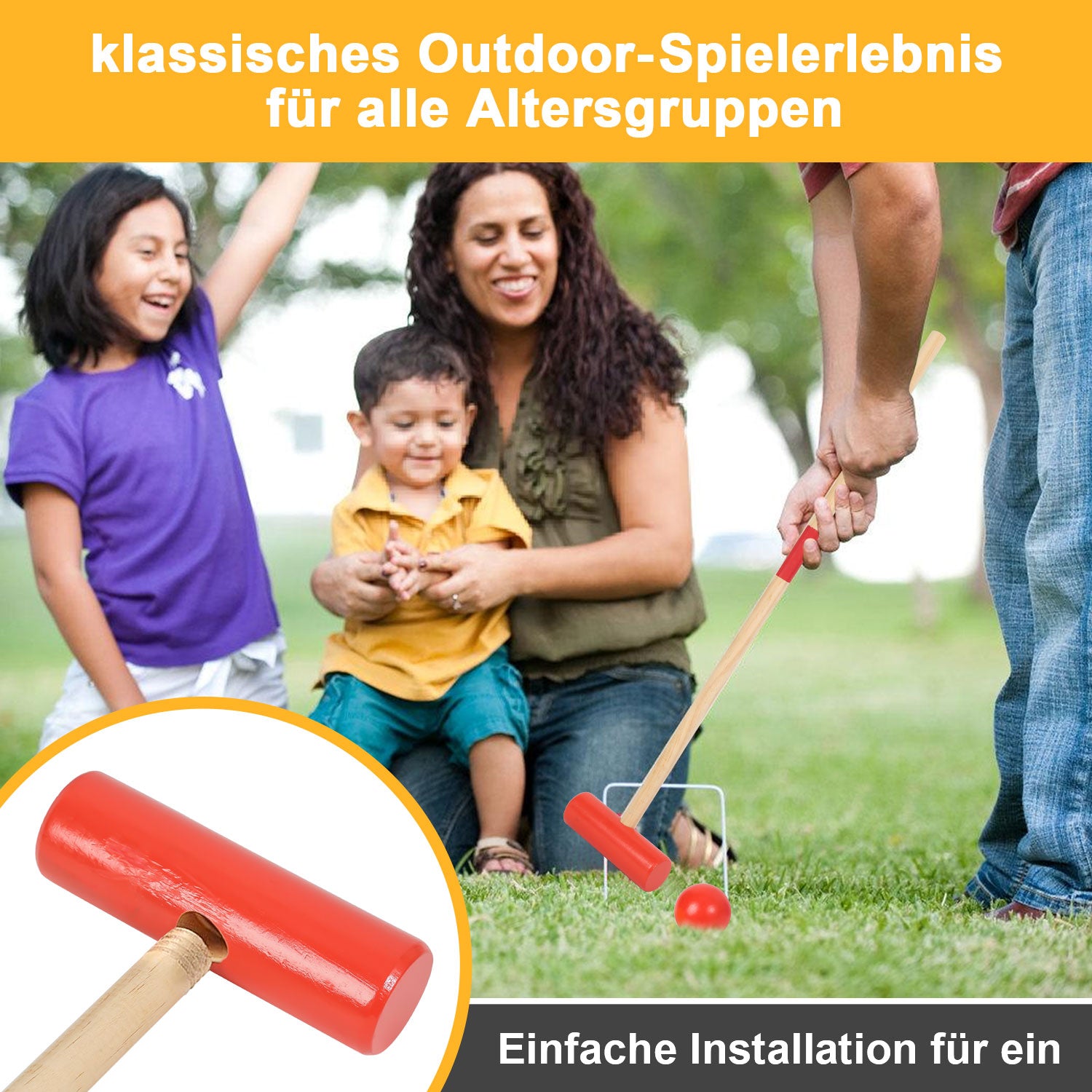 Jederzeit und überall: Egal, ob Sie einen Garten, einen Hinterhof oder einen Park in der Nähe haben, mit unseren Krocket-Sets können Sie jeden Ort in einen aufregenden Spielplatz verwandeln. Genießen Sie die frische Luft, die Natur und die Gesellschaft von Familie und Freunden, während Sie in diesem herausfordernden Spiel gegeneinander antreten.