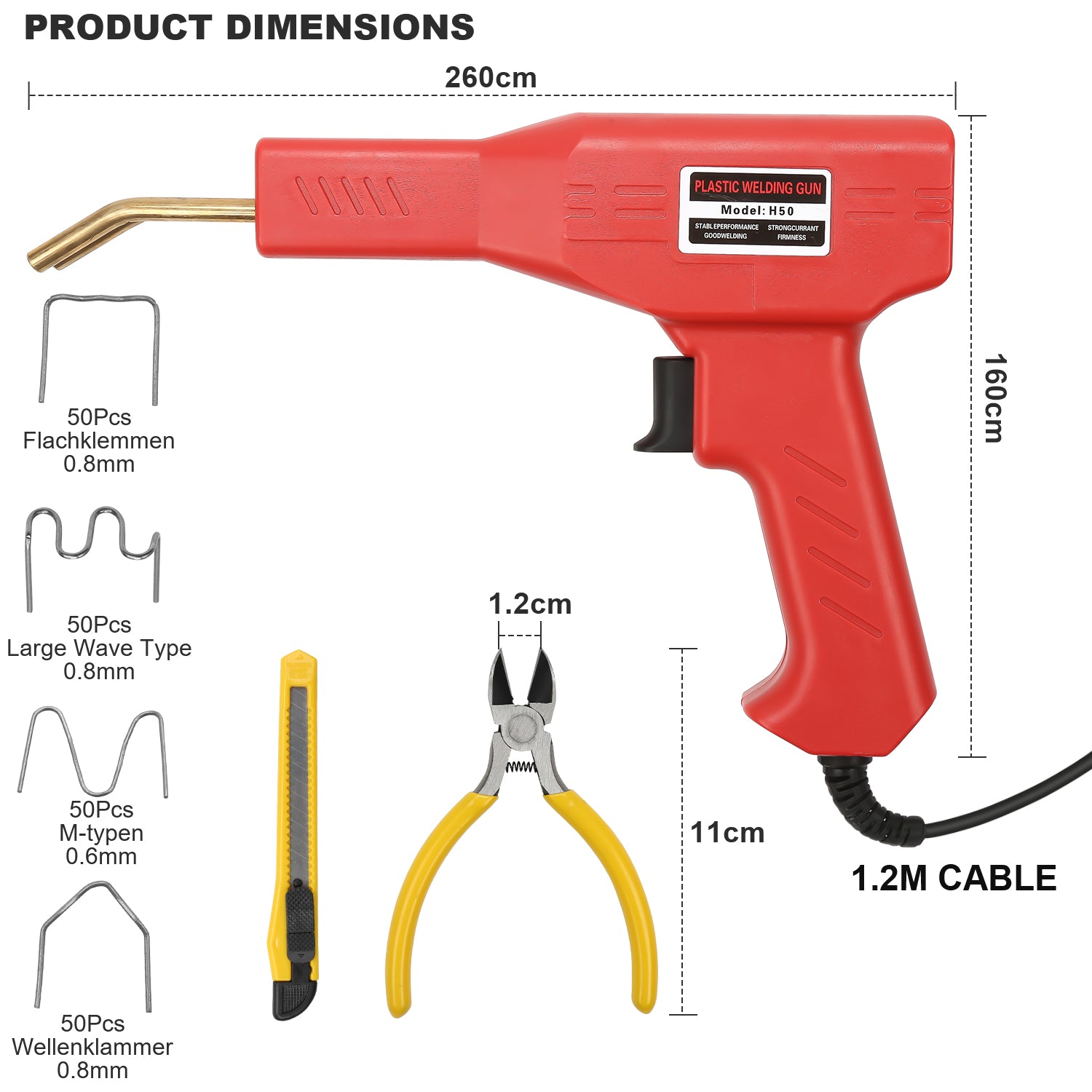 Einfach zu Bedienen: Wählen Sie die richtige Schweißnagel, um sie in den Messinghalter einzuführen, drücken Sie die Einschalttaste, warten Sie ein paar Sekunden, bis sie sich erwärmt und langsam mit dem Kunststoffteil verschmilzt, und schon sind Sie fertig. 4 Arten von Schweißnagel sind verfügbar, um die meisten Ihrer Bedürfnisse zu erfüllen.