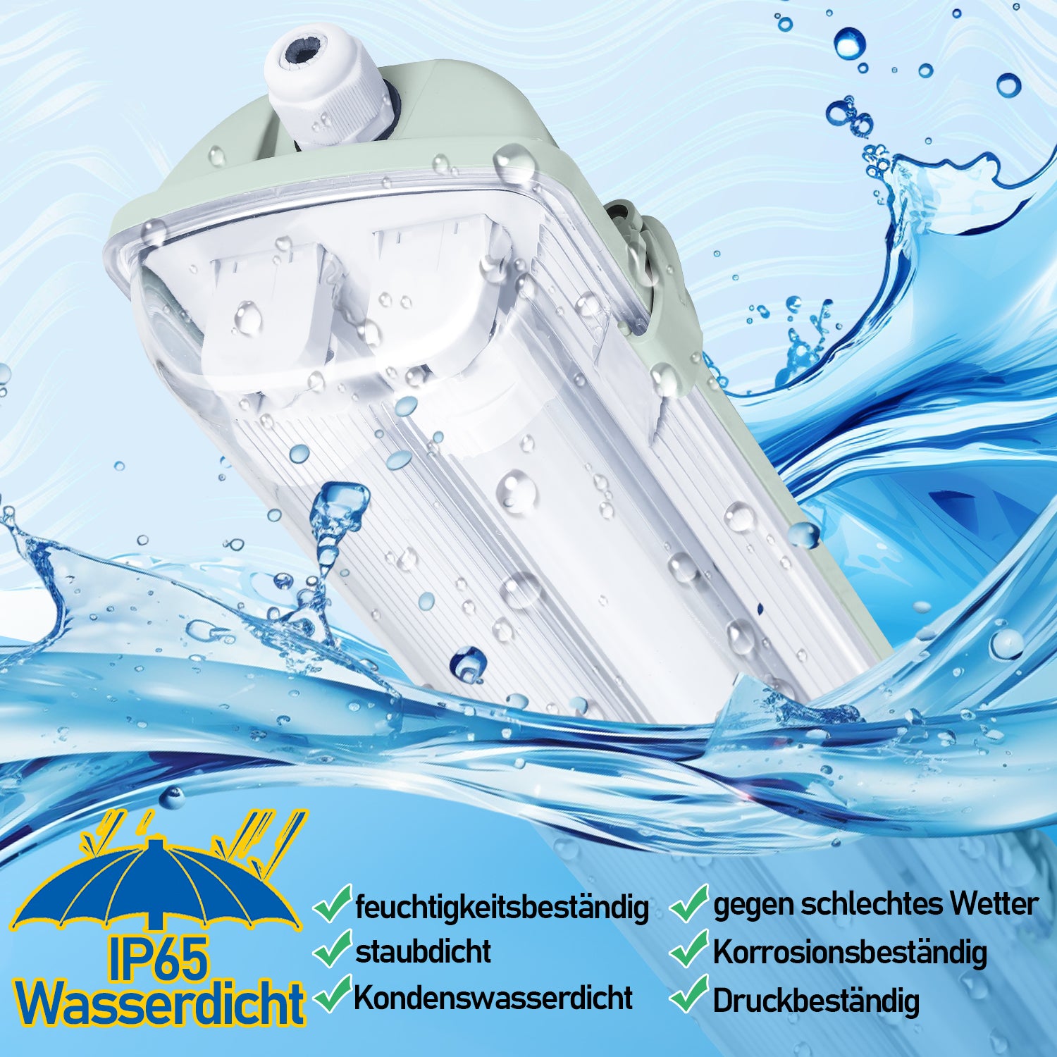 IP65 Wasserdicht: Die Feuchtraumleuchte LED ist nach IP65 wasserdicht zertifiziert, was bedeutet, dass sie gegen Staub und Wasserstrahlen geschützt ist. Sie kann problemlos in Umgebungen mit hoher Luftfeuchtigkeit oder sogaar Spritzwasser installiert werden, ohne die Leistung zu beeinträchtigen.