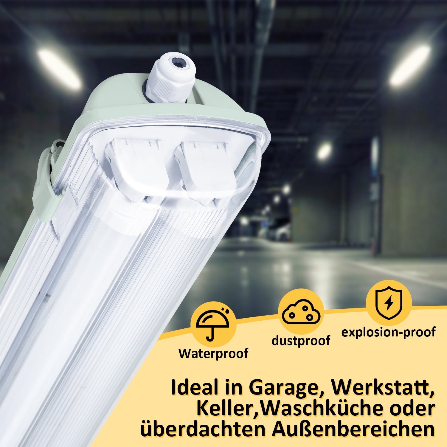 Vielseitige Anwendung: Dank ihres robusten Designs eignet sich die Feuchtraum Lampe für verschiedene Einsatzbereiche, sowohl in privaten als auch gewerblichen Umgebungen. Sie kann in Werkstätten, Fabriken, Lagerhallen, Badezimmer, Waschküchen, Garagen und Keller werden.