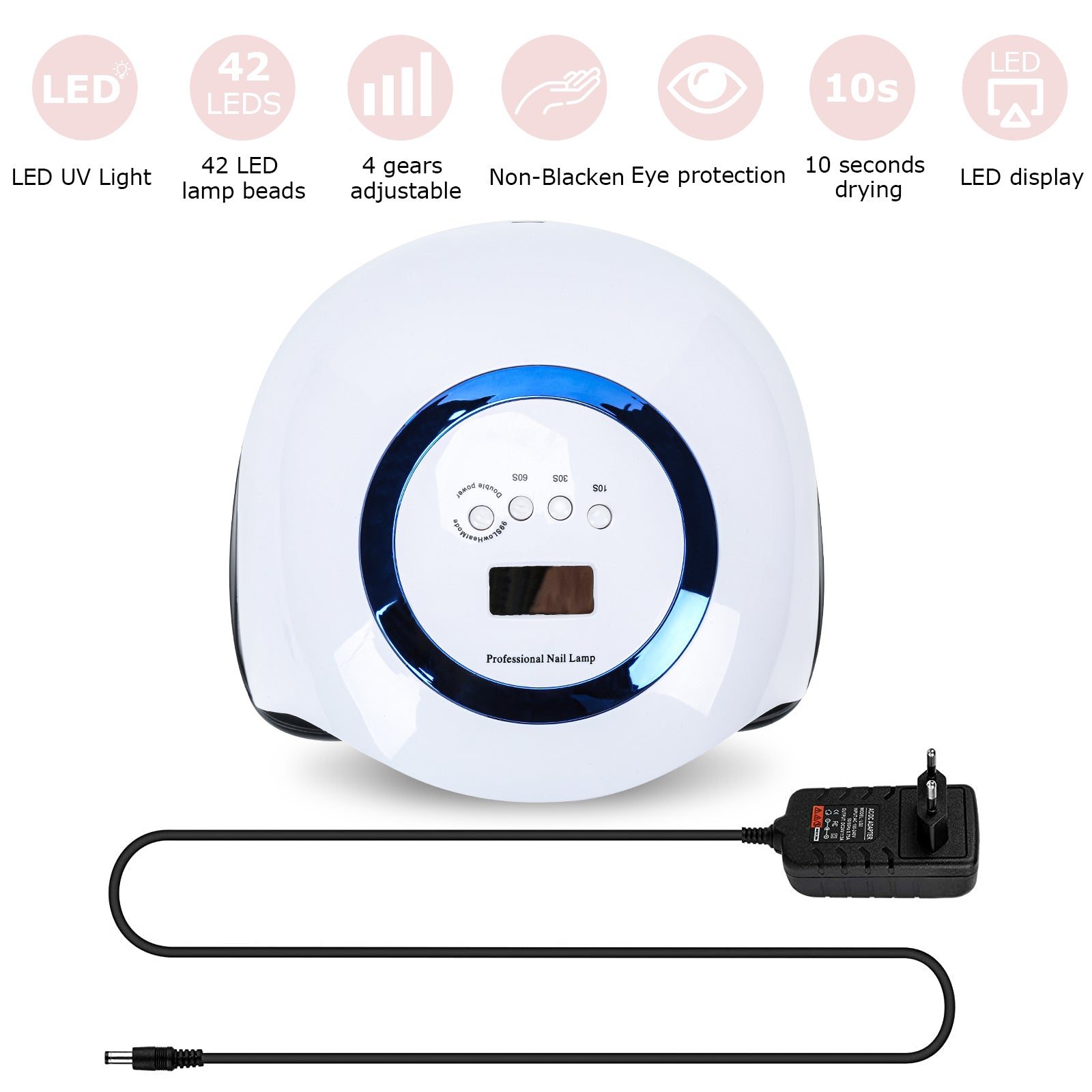 【Super Schnelles Trocknen 】Mit unserer 168W UV Lampe für Nägel zu trocknen nimmt nur 10 Sek. Zeit. Mit unserem professionellen LED Nageltrockner werden die Gele sofort hart und trocken. Im Vergleich zu anderen Produkten kann unsere LED Lampe Nägel schneller trocknen, Sie sparen dabei 80% der Aushärtungszeit und auch . Ausgestattet mit 42 Glühlampen LED mit doppelter Wellenlänge von 365-405nm, die Augen und Haut nicht schädigt.