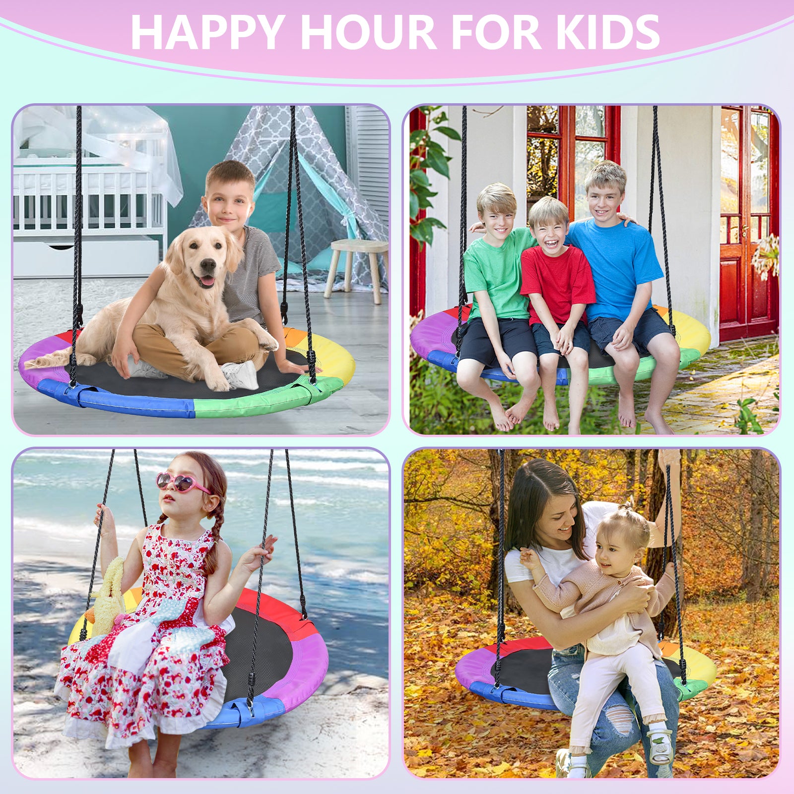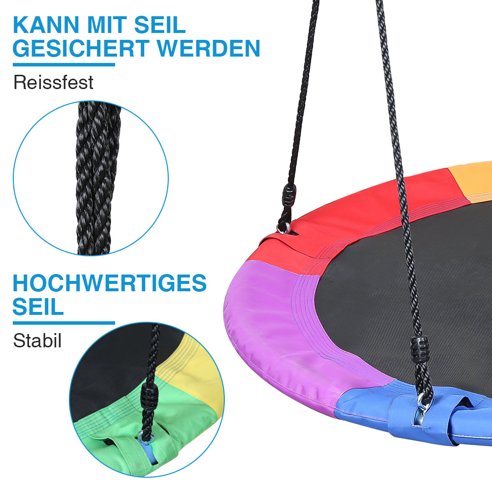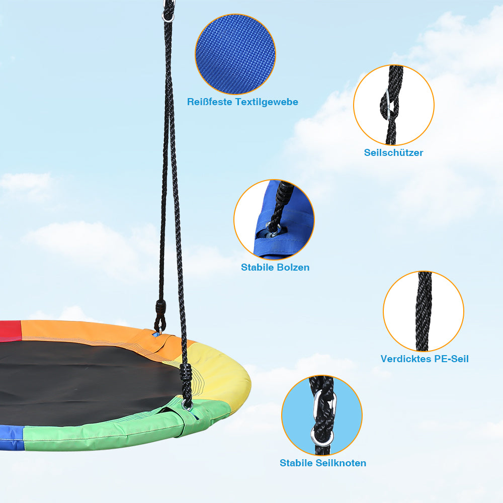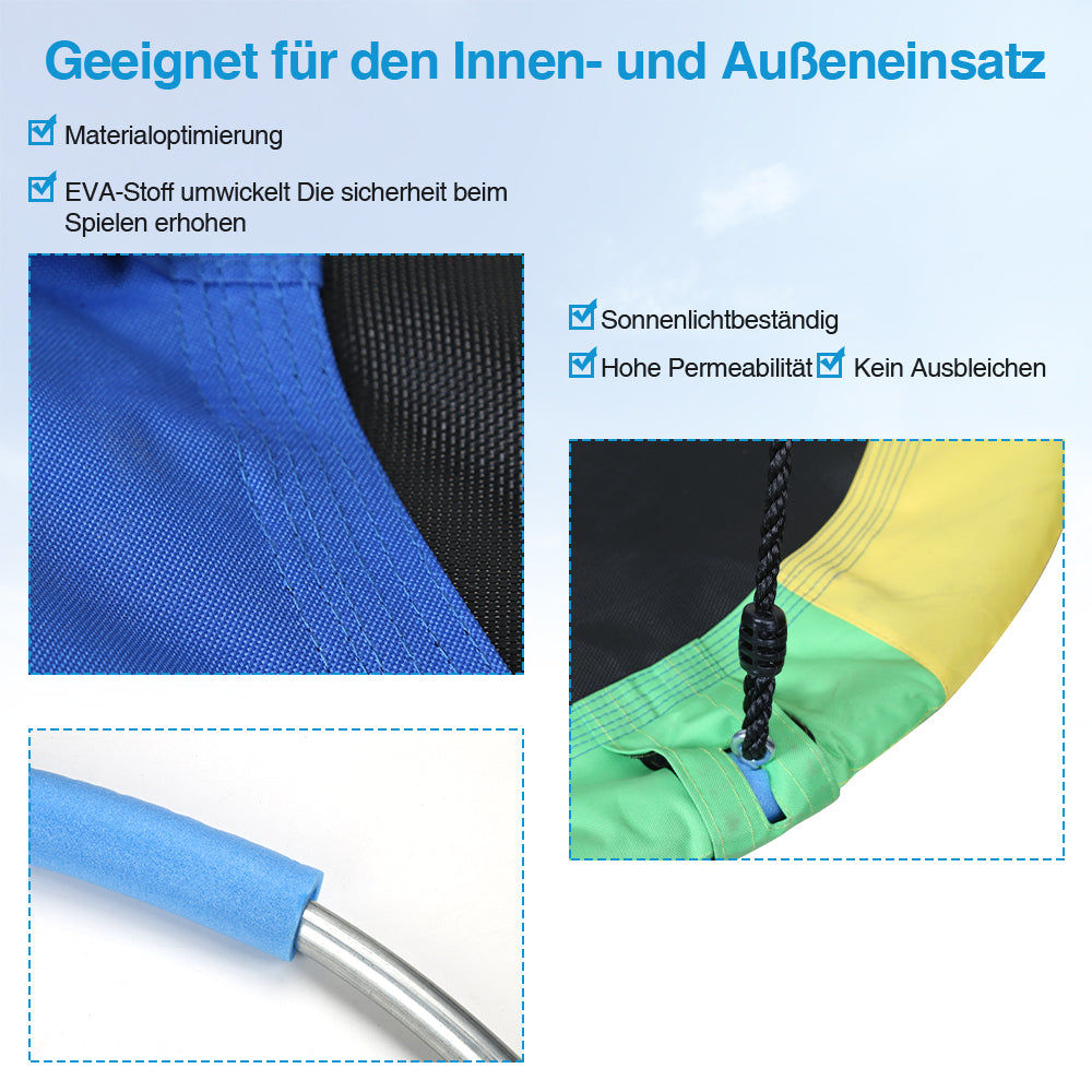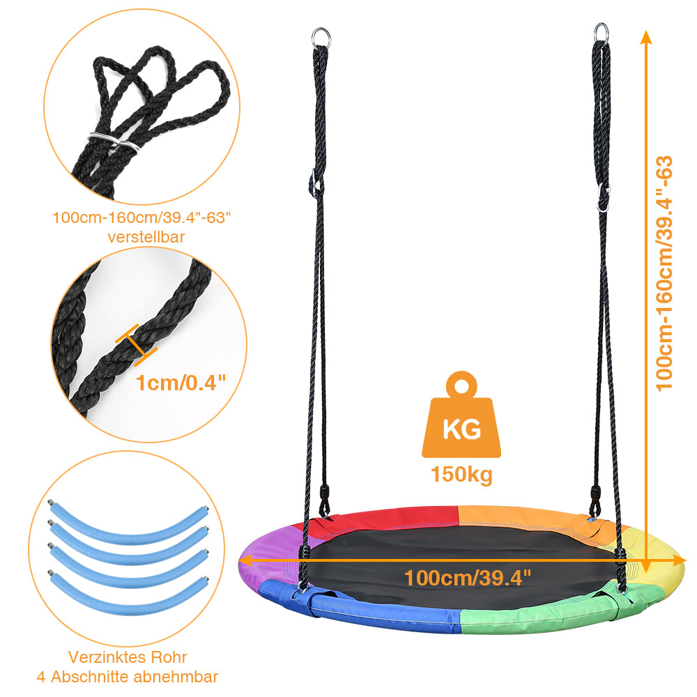Maximale Belastung bis zu 150kg: Schaukeldurchmesser 100 cm, für Kinder und Erwachsene. Für den Innen- und Außenbereich geeignet. Um die Lebensdauer der Schaukel zu verlängern, sollte sie vor starker Sonneneinstrahlung und anderen Einflüssen geschützt und bei längerer Nichtbenutzung weggestellt werden.