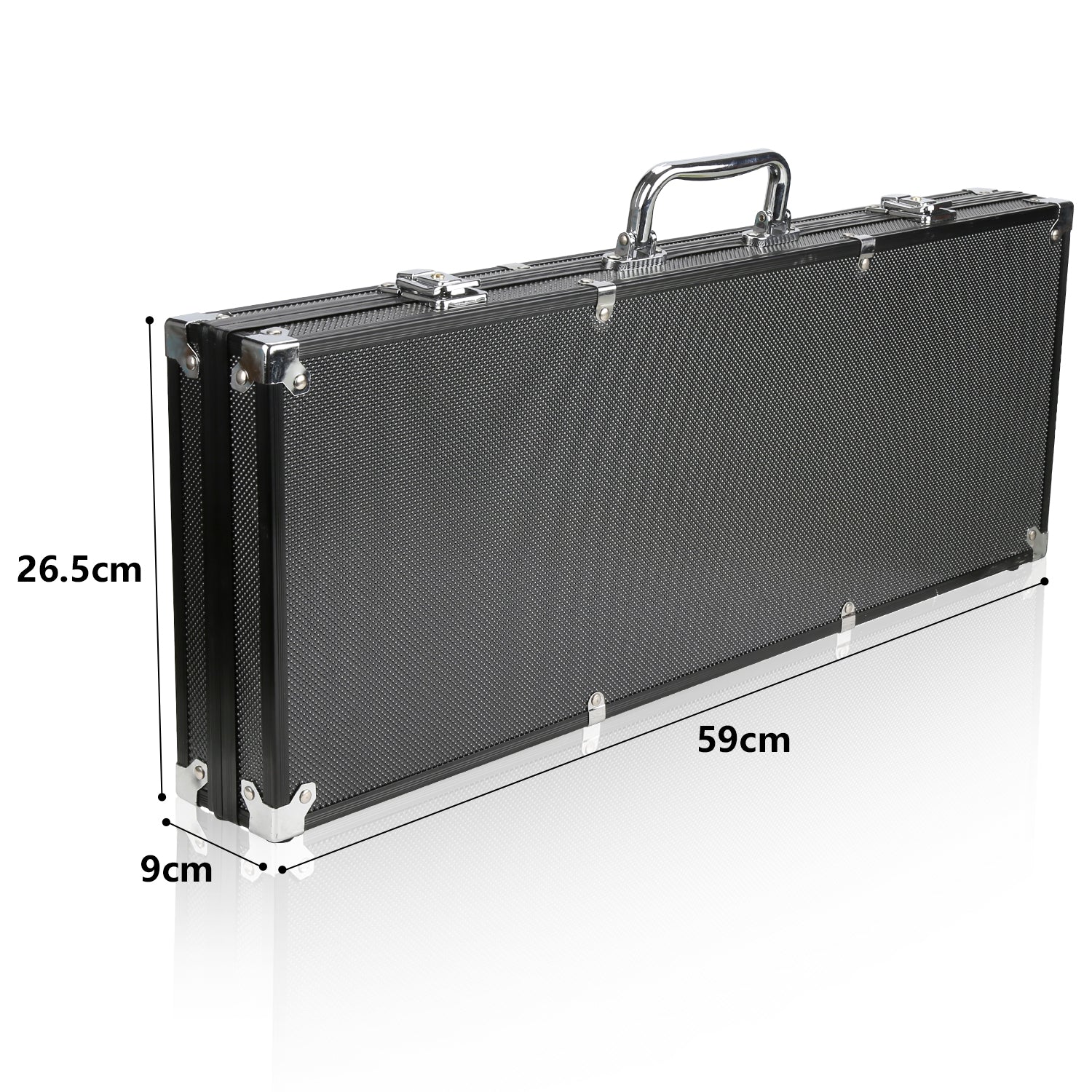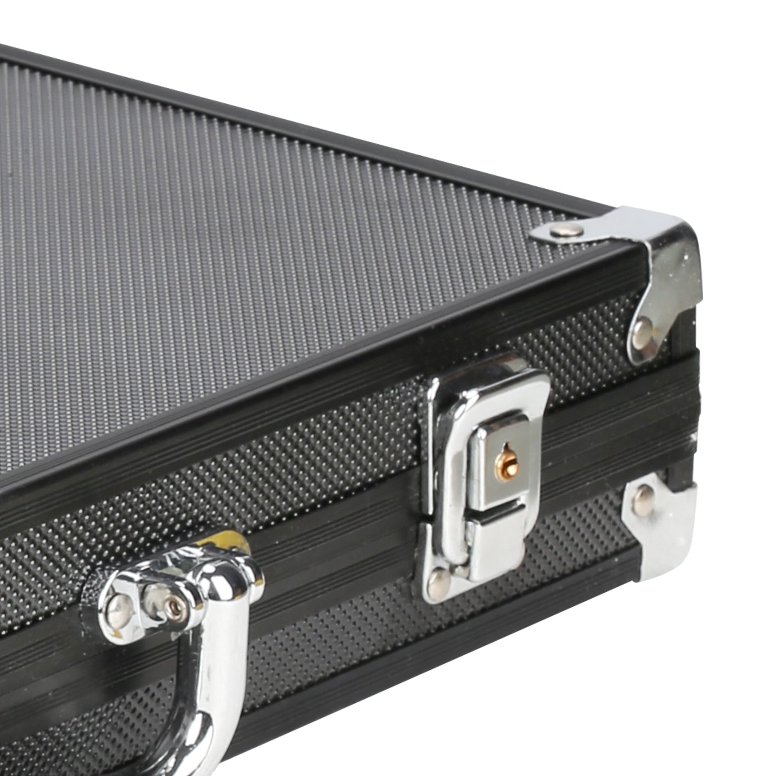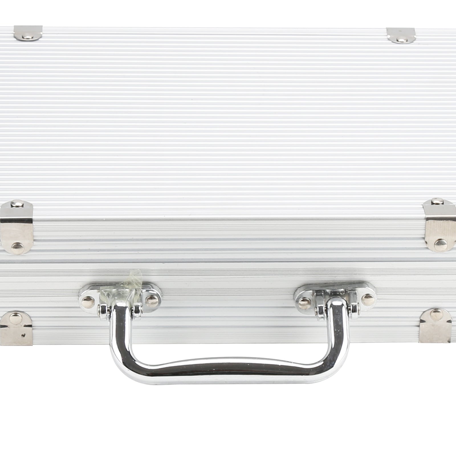 Hochwertige Alubox - Poker set aus einer robusten Aluminiumschale und einem inneren Stahlkern. Im Inneren befindet sich ein Wattepad aus schwarzer Perlenbaumwolle, das den Inhalt vor zufälligen Streuungen schützen kann.