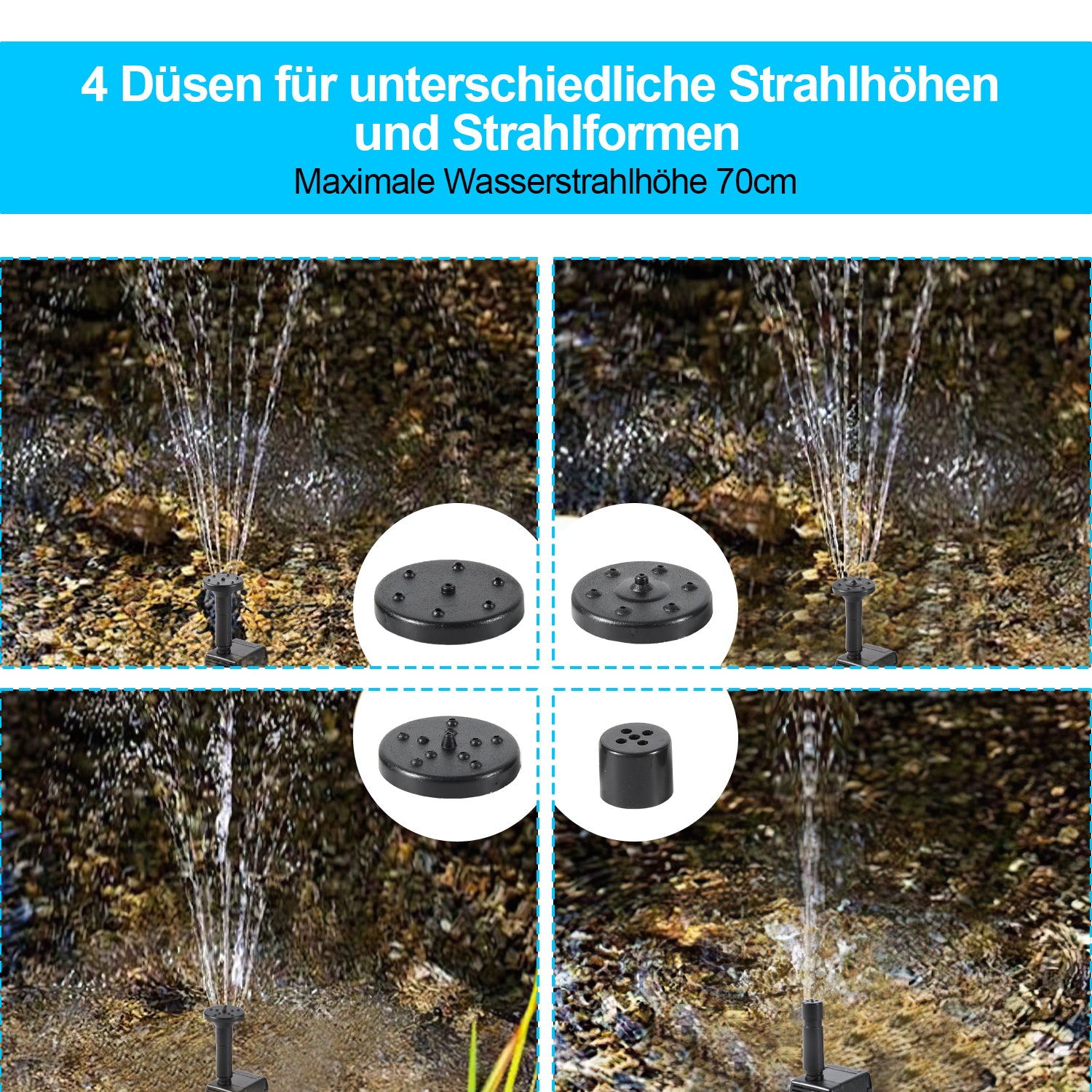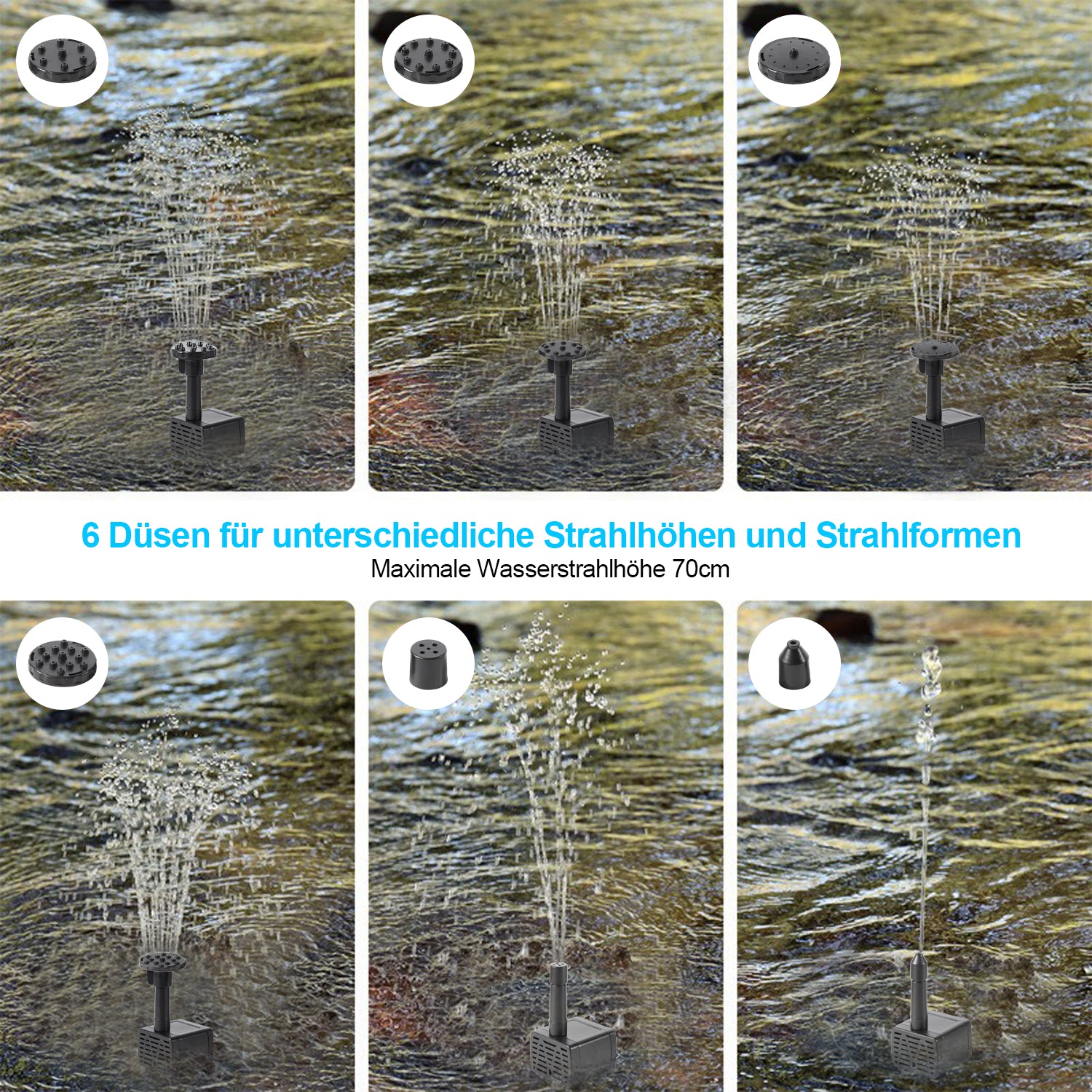 Höhe des Springbrunnens einstellbar: Diese Pumpe kann Wasser 30-70 cm hoch in die Luft sprühen und ist mit 4/6 verschiedenen Düsen ausgestattet, um das Muster und die Höhe des Springbrunnens zu variieren. Die Düsen können problemlos ausgetauscht werden.