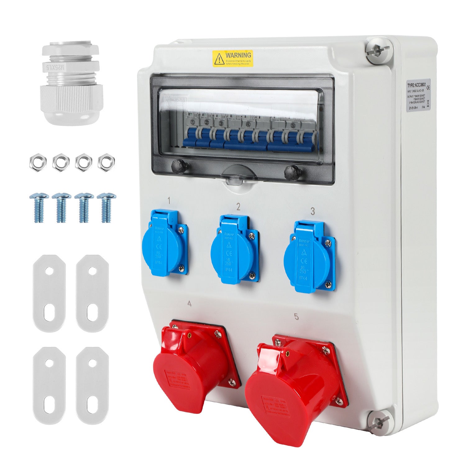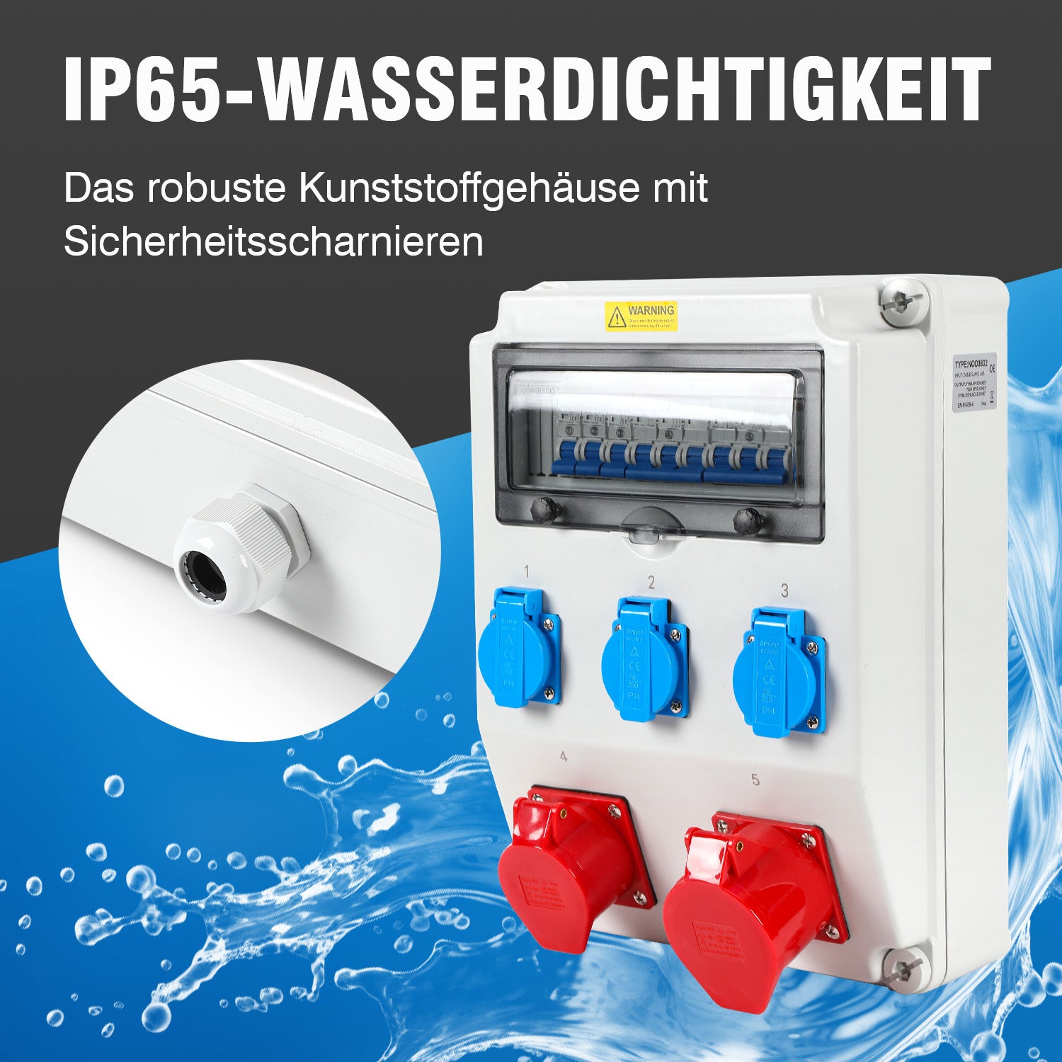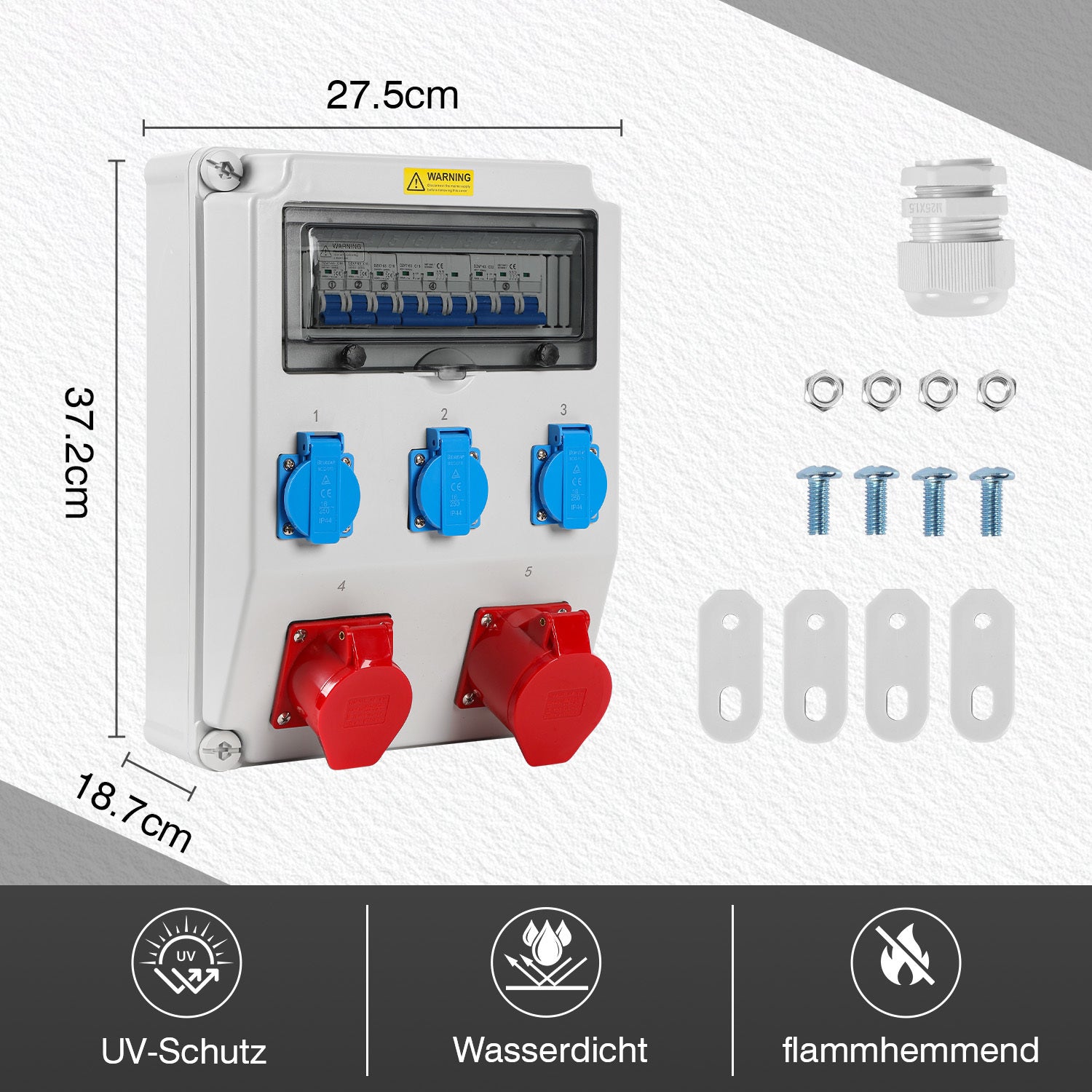 Wasserdicht: IP44 wasserdicht bewertung. Das robuste Kunststoffgehäuse mit Sicherheitsscharnieren verhindert das Auslaufen von Wasser, Staub und Schmutz und Baustromverteiler ist daher ideal für den Außenbereich geeignet.