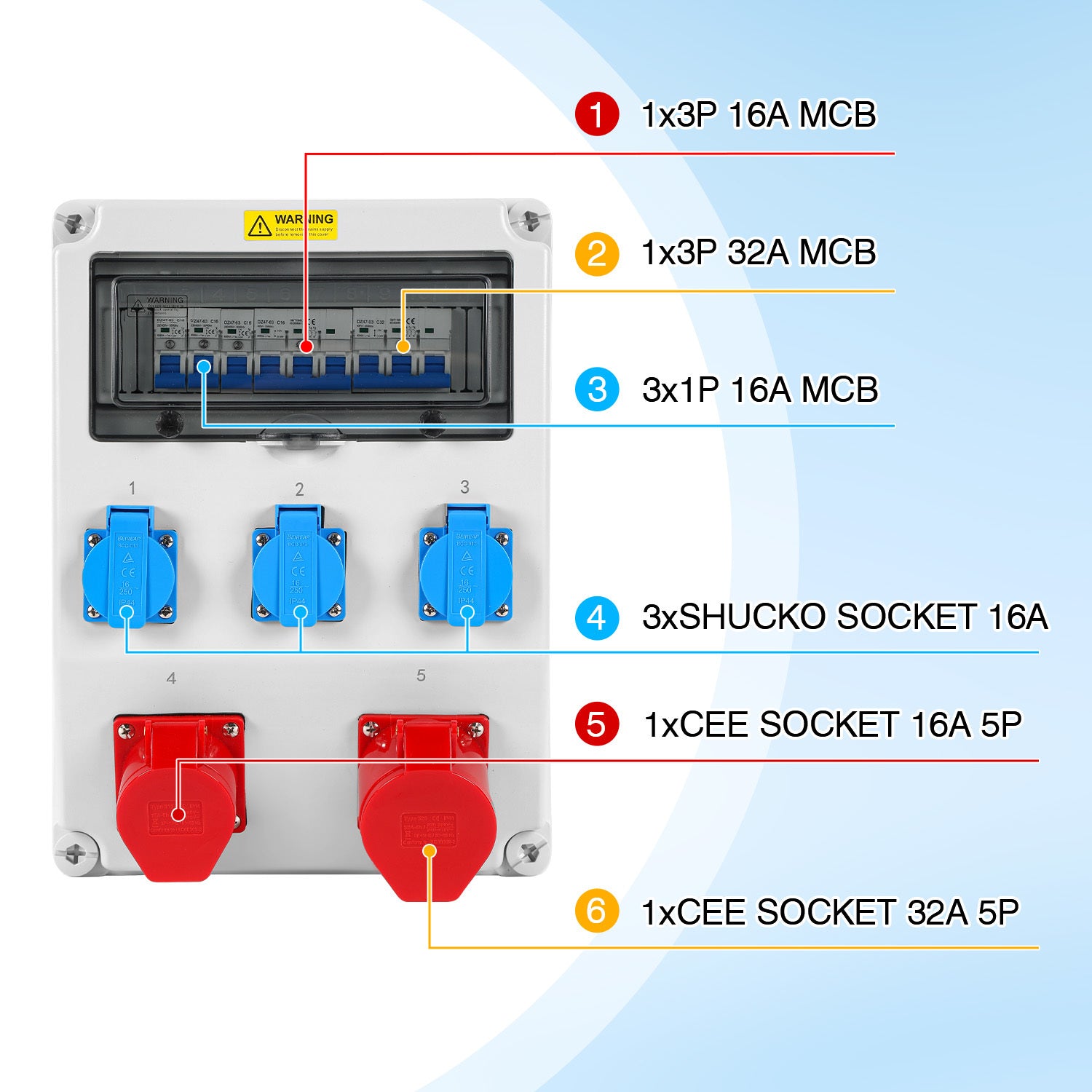 Sicherheit:Alle Abgänge sind mit integrieter Sicherung abgesichert. D.h. die Schukosteckdosen sind jeweils einzeln mit einem Sicherautomat 16A und die CEE 400V-16A bzw. CEE 400V-32A Steckdosen zusammen abgesichert. Sicherheit und sichere Verwendung.